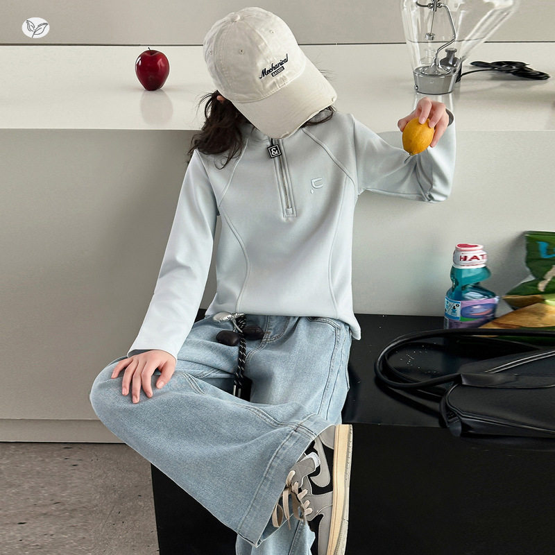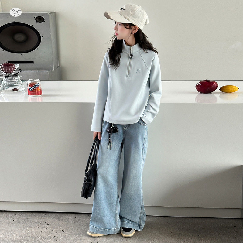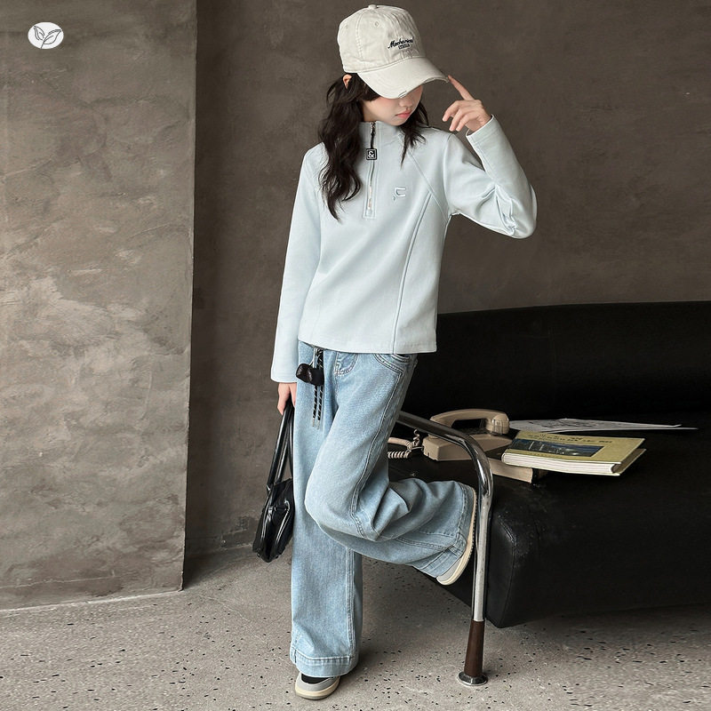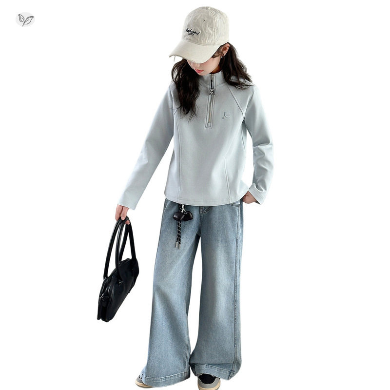 女童休闲套装2026年春季新款中大童半拉链卫衣牛仔裤两件套春秋装