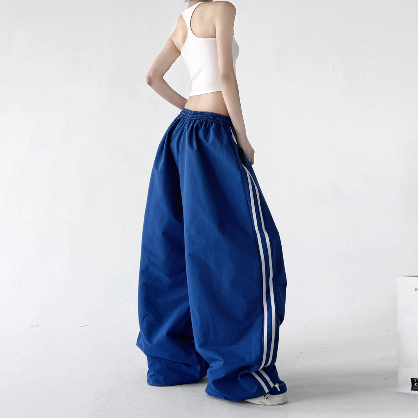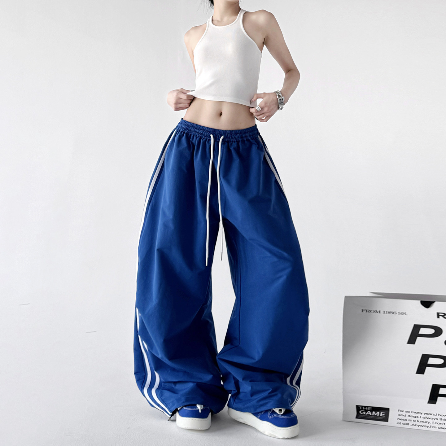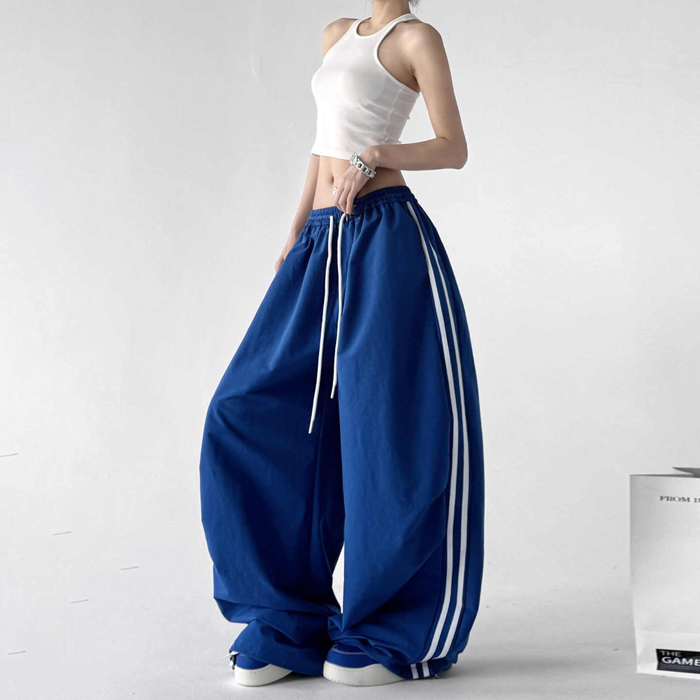 原创设计感运动裤女2026春装新款蓝色阔腿裤高腰显瘦抽绳休闲裤子