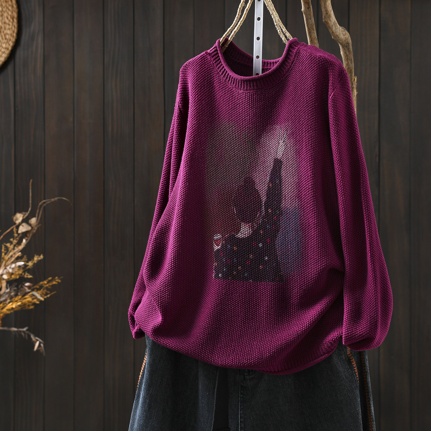 黄色毛衣2026正流行女款秋冬季新款棉线针织印花洋气宽松套头上衣