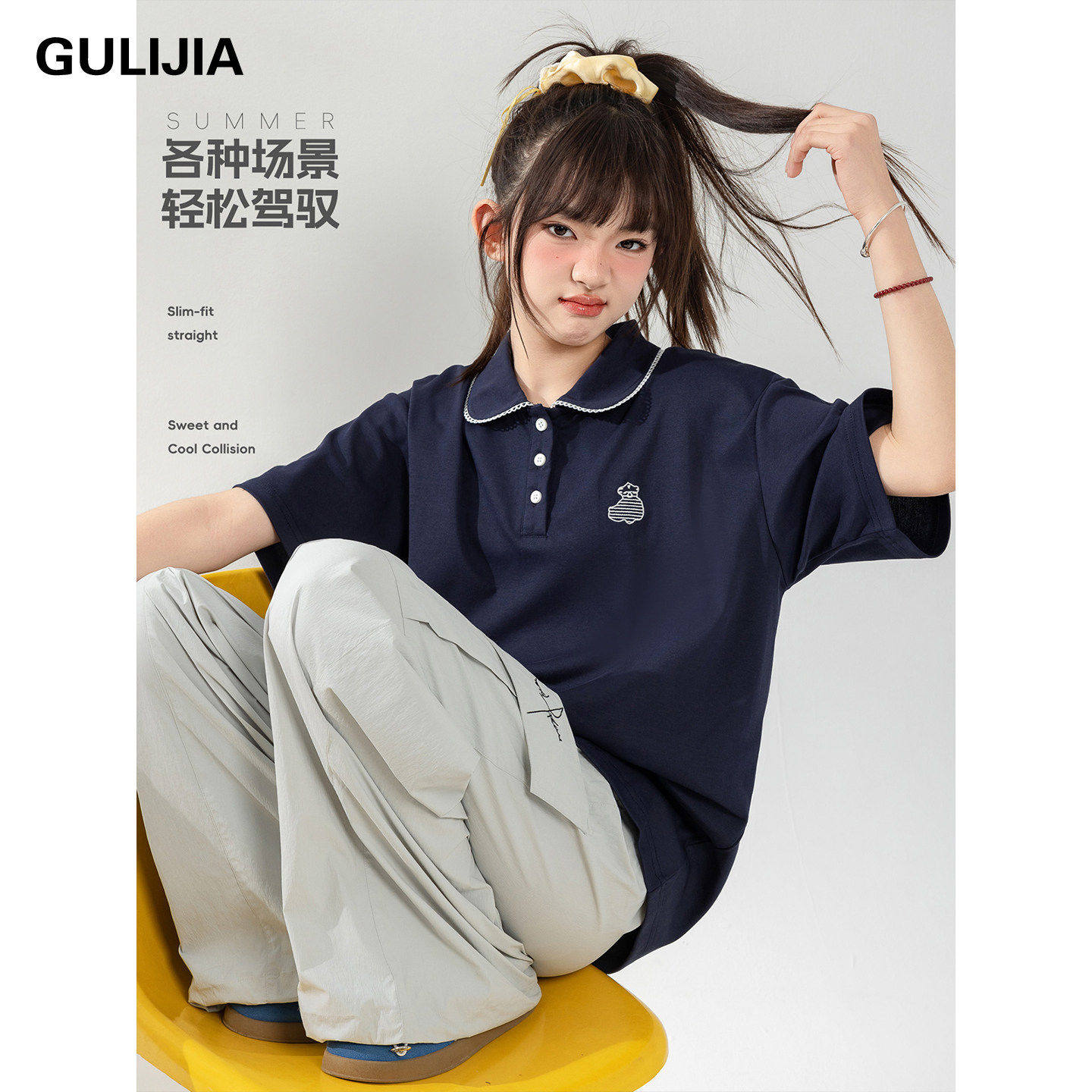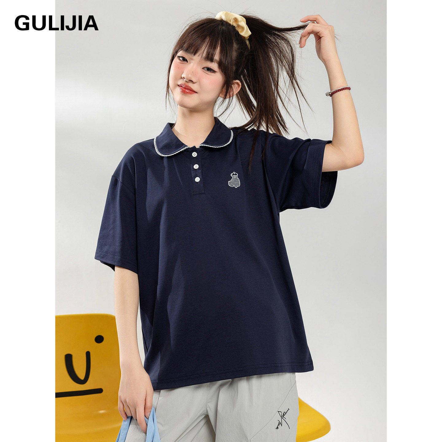 优蜜屋学院风POLO领短袖T恤女大童夏装娃娃领刺绣初中生休闲上衣