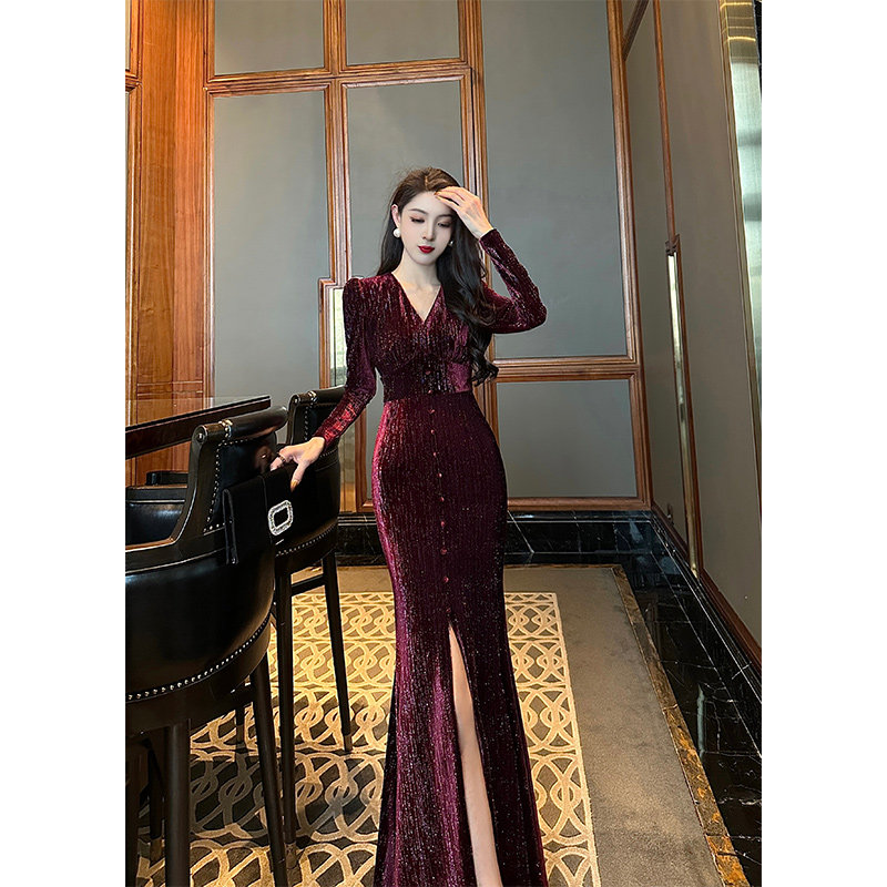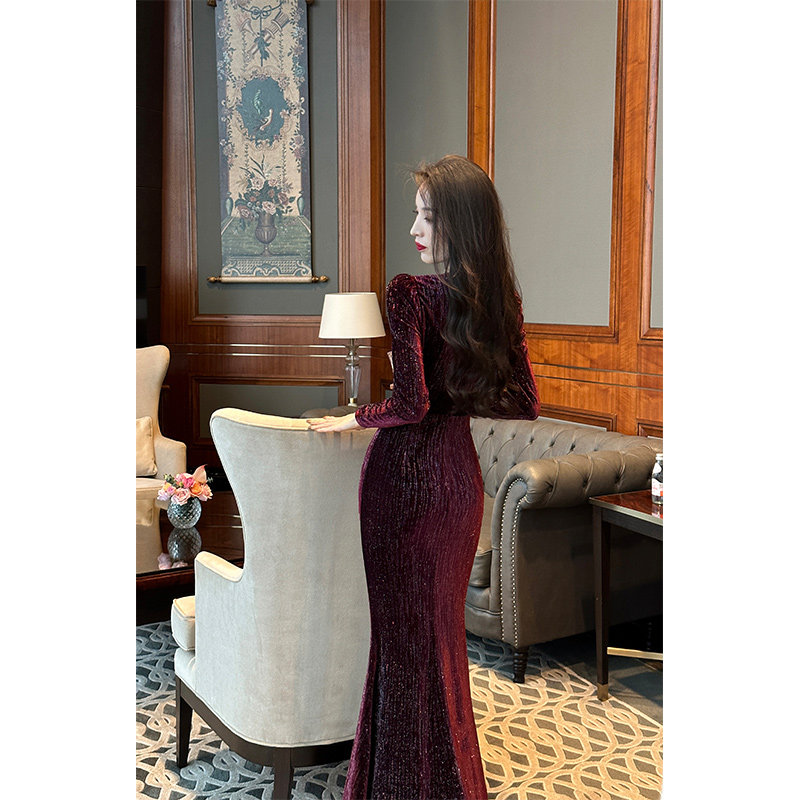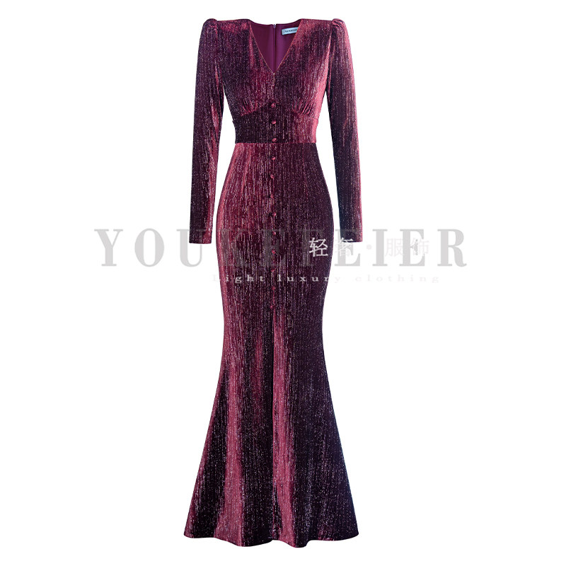 【尤克菲儿】原创设计丝绒亮丝复古鱼尾精致优雅长袖V领连衣裙