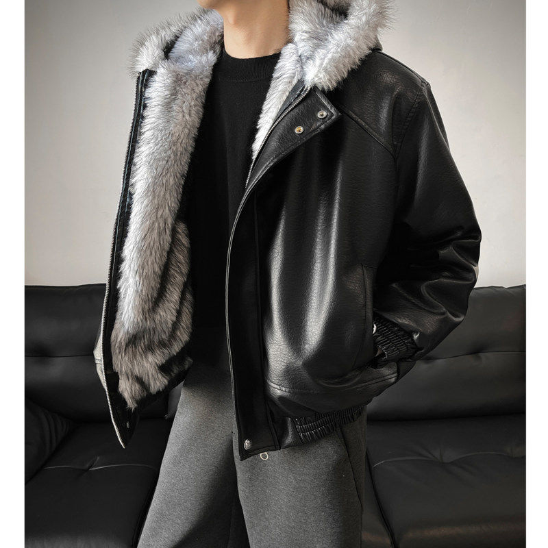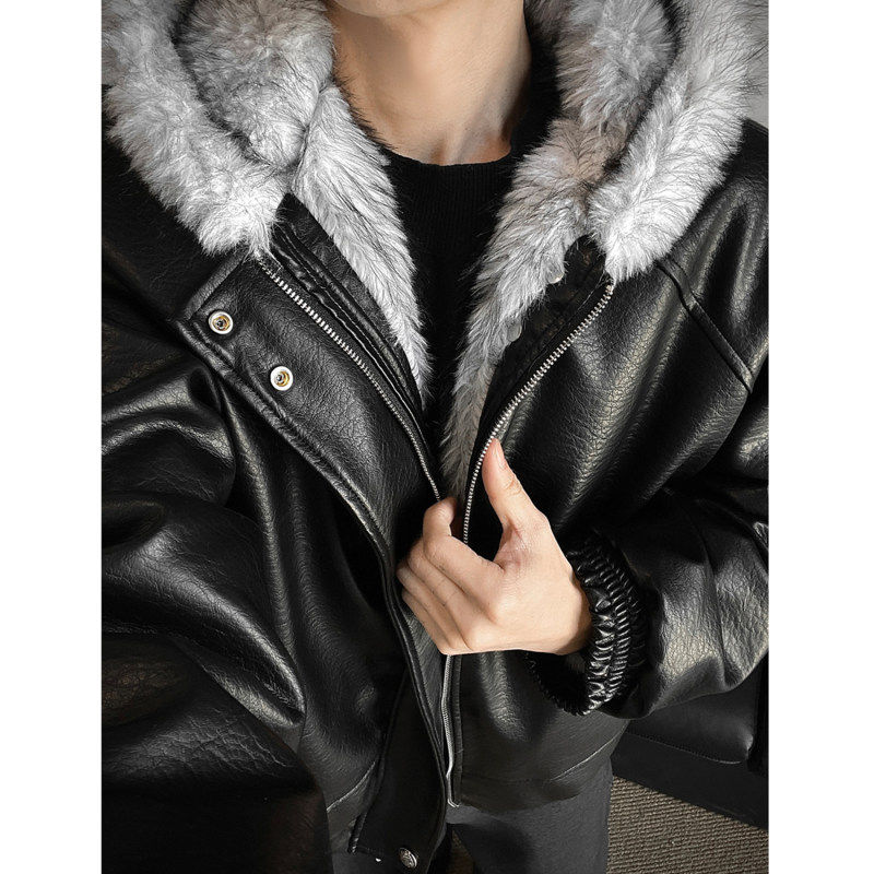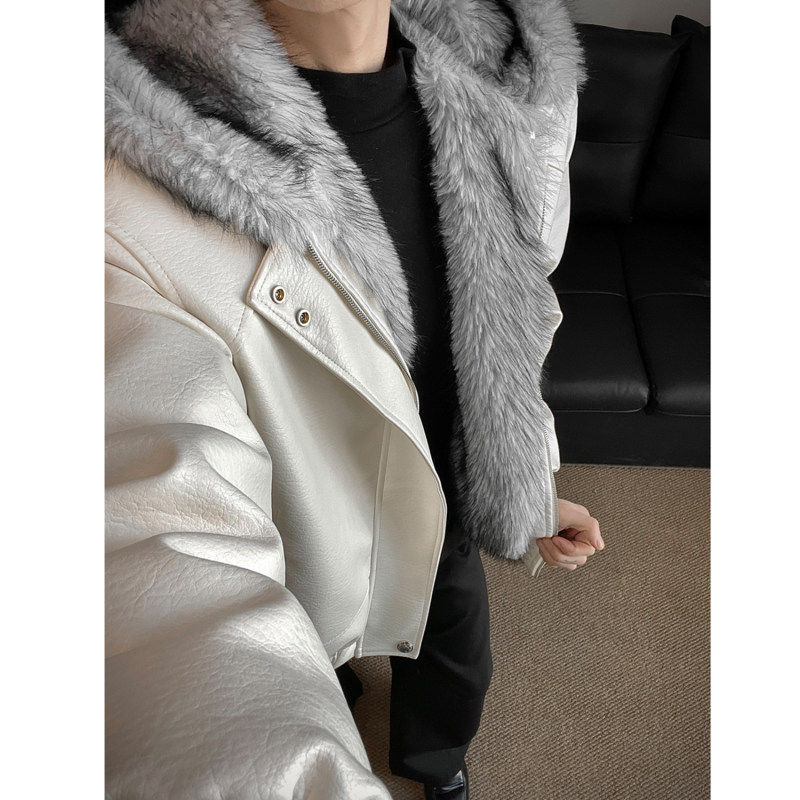 座山雕白色pu皮连帽棉服男款冬季高级感痞帅加厚夹棉保暖棉衣外套