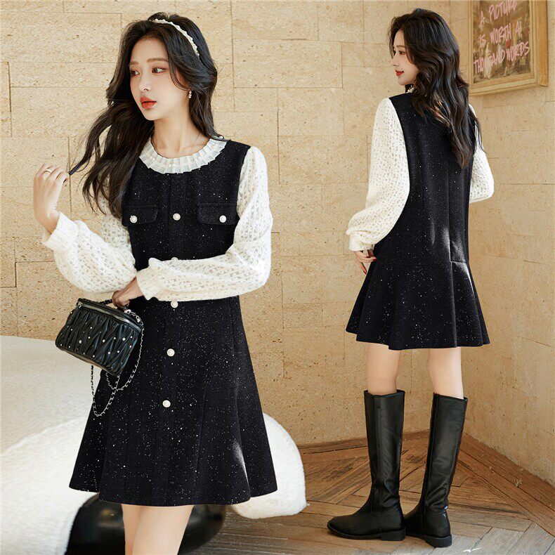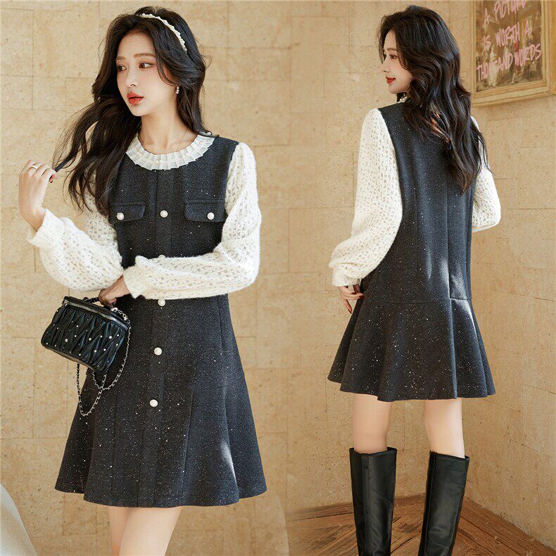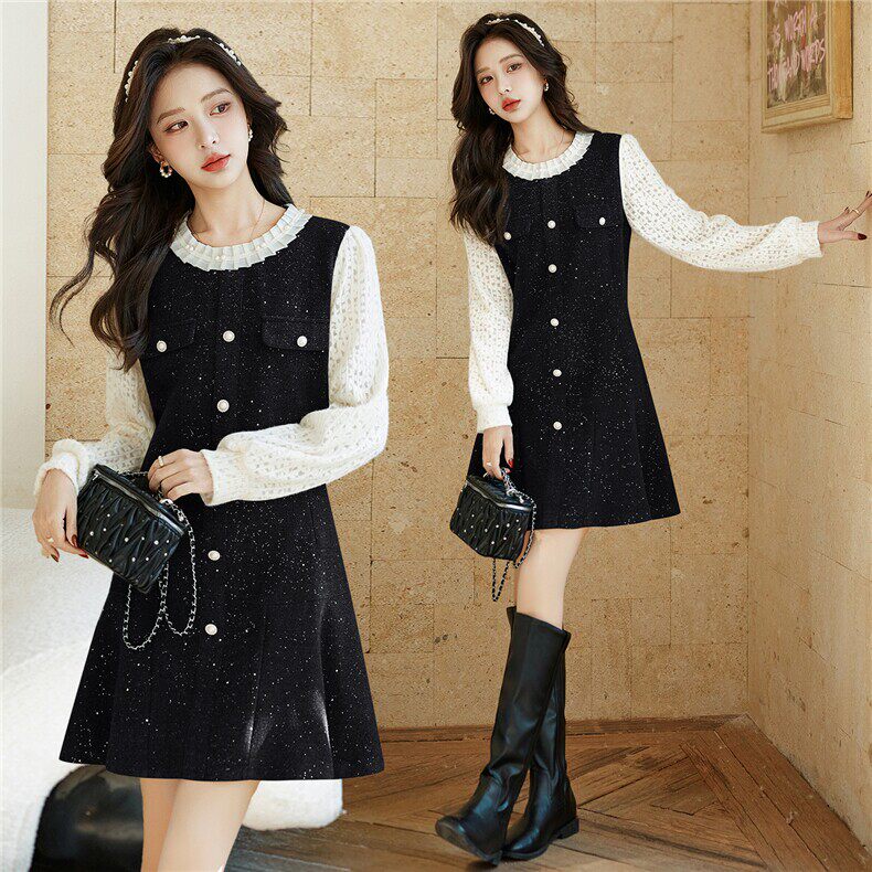 小香风假两件连衣裙女长袖蕾丝拼接显瘦气质小个子裙子