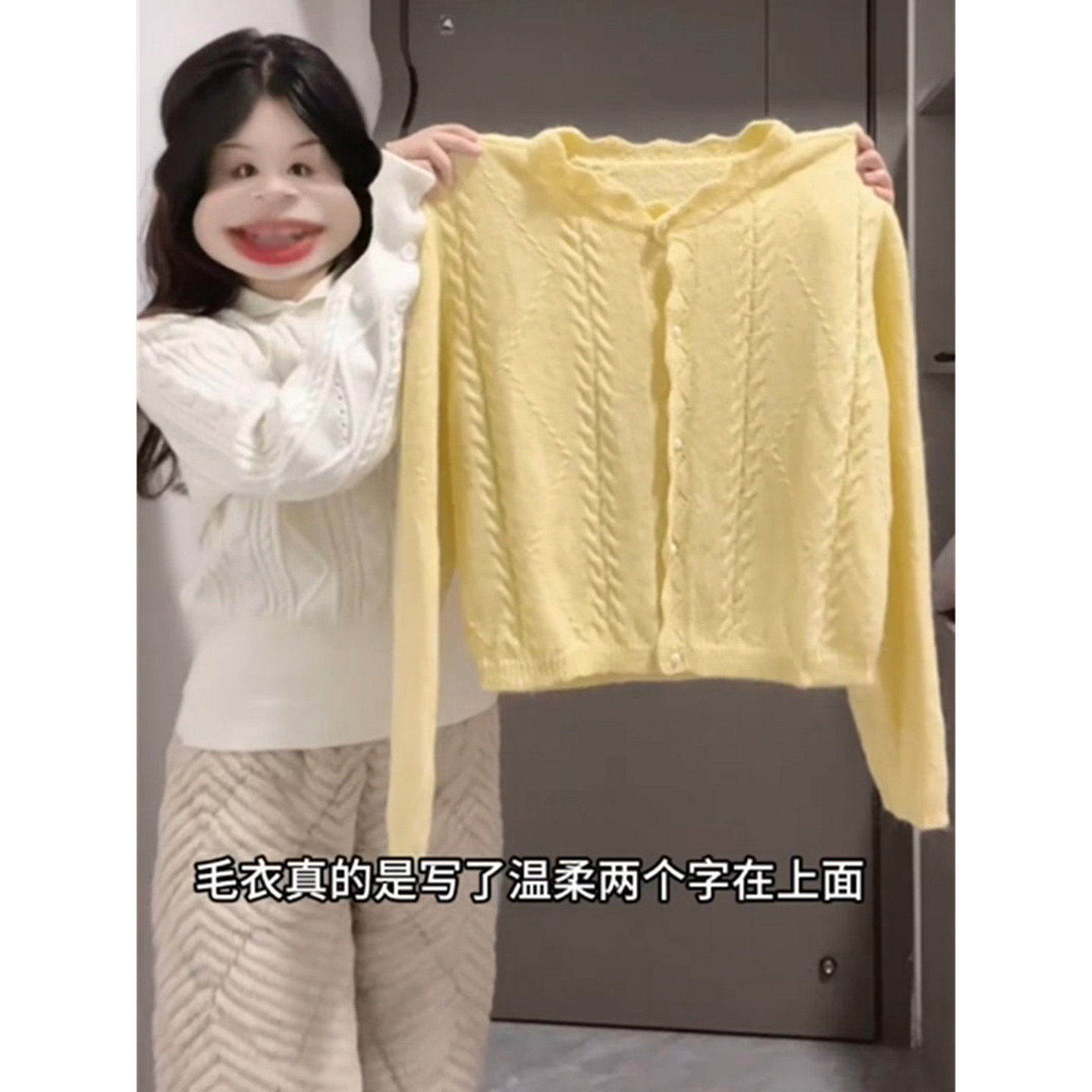 韩系氛围感奶黄色镂空针织开衫女2026早春新款甜美显瘦软糯薄外搭