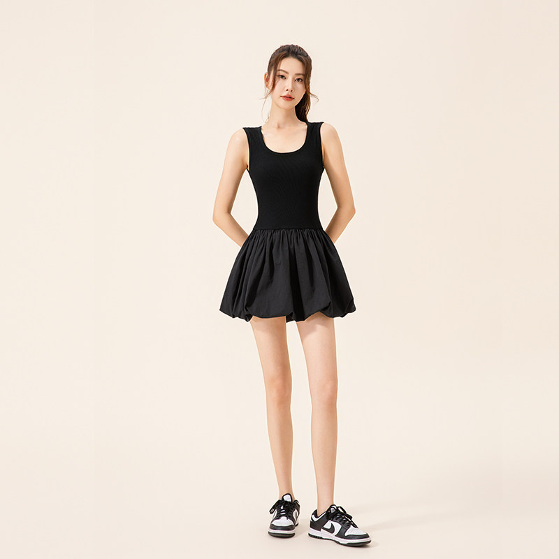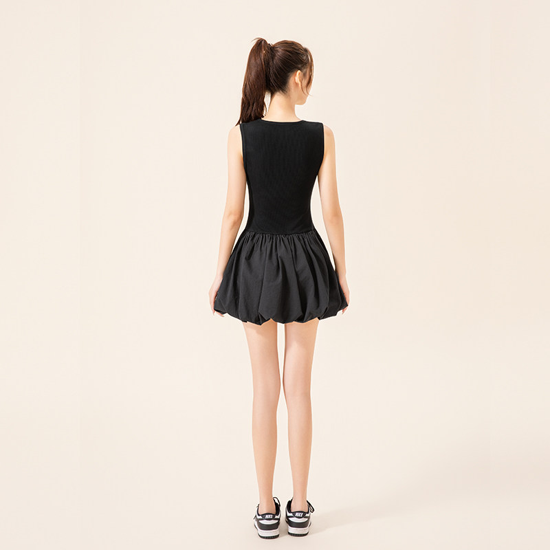 大码修身花苞蓬蓬连衣裙短款女黑色女士收腰质感