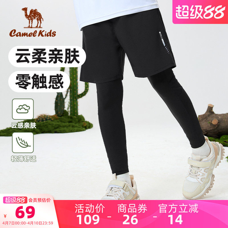 小骆驼男童运动紧身运动透气长裤篮球足球训练假两件儿童跑步裤子