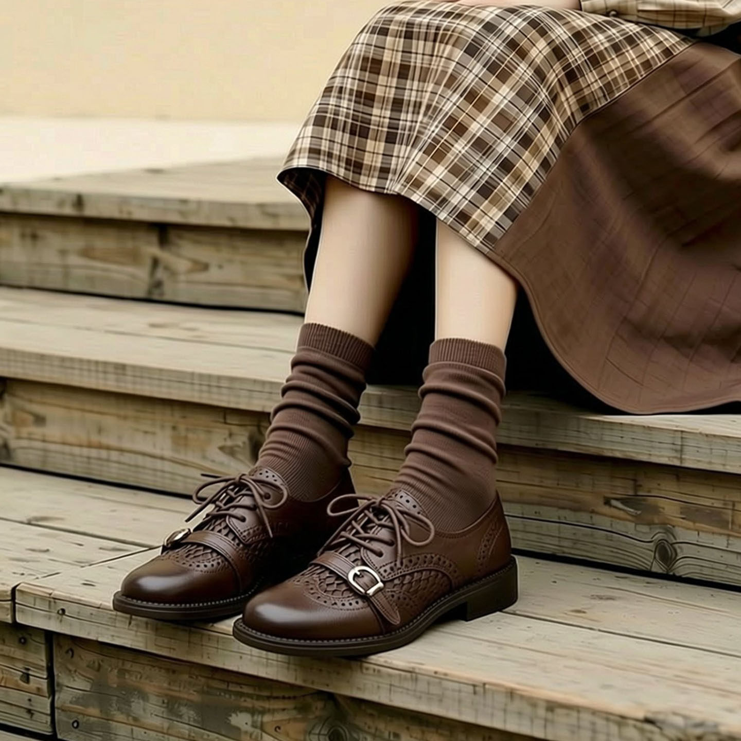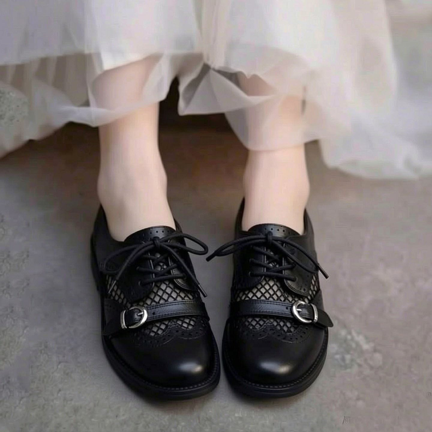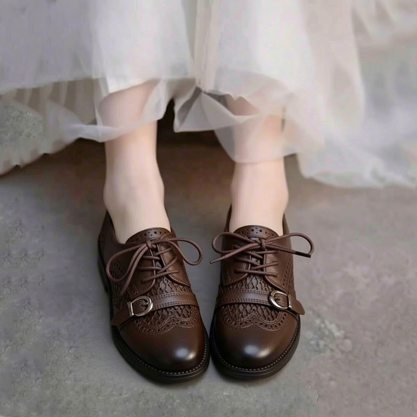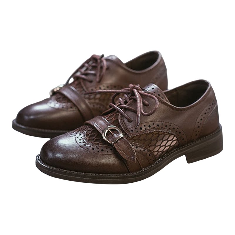 头层牛皮单鞋女2026春夏透气镂空布洛克皮带扣时尚复古中跟乐福鞋