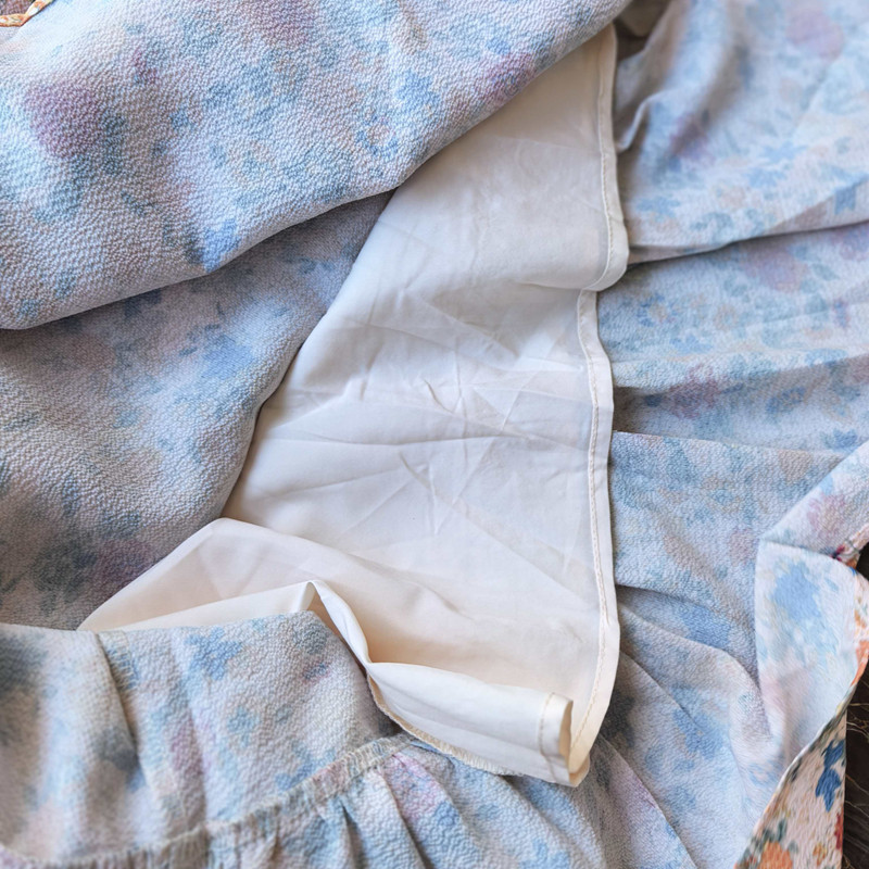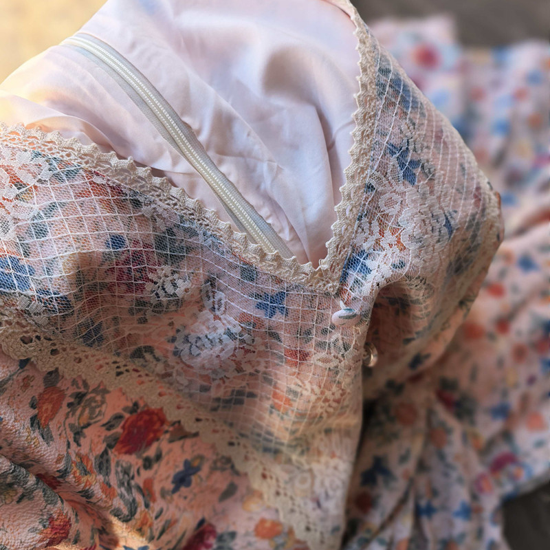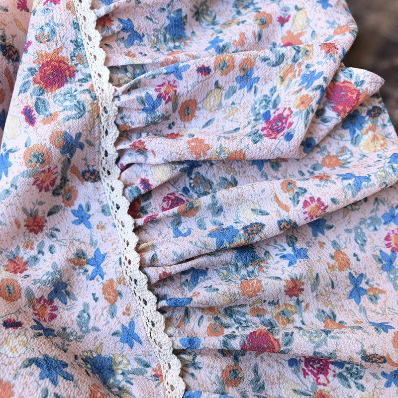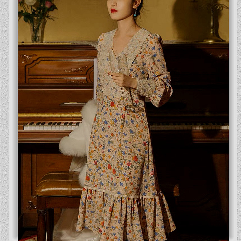 优雅复古鱼尾连衣裙 雪纺长袖V领修身打底碎花中长 蕾丝拼接法式