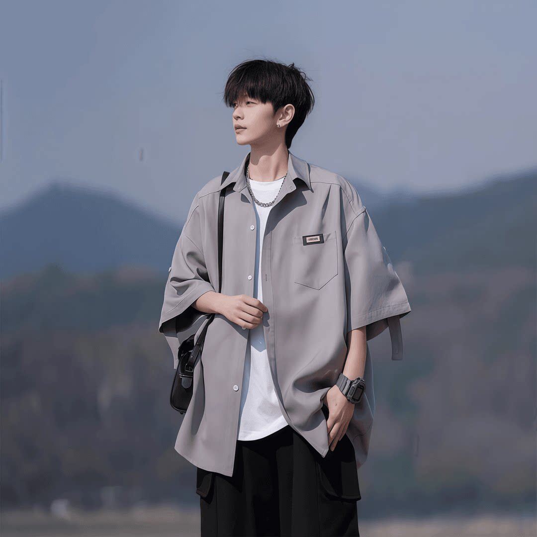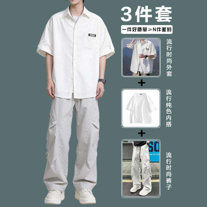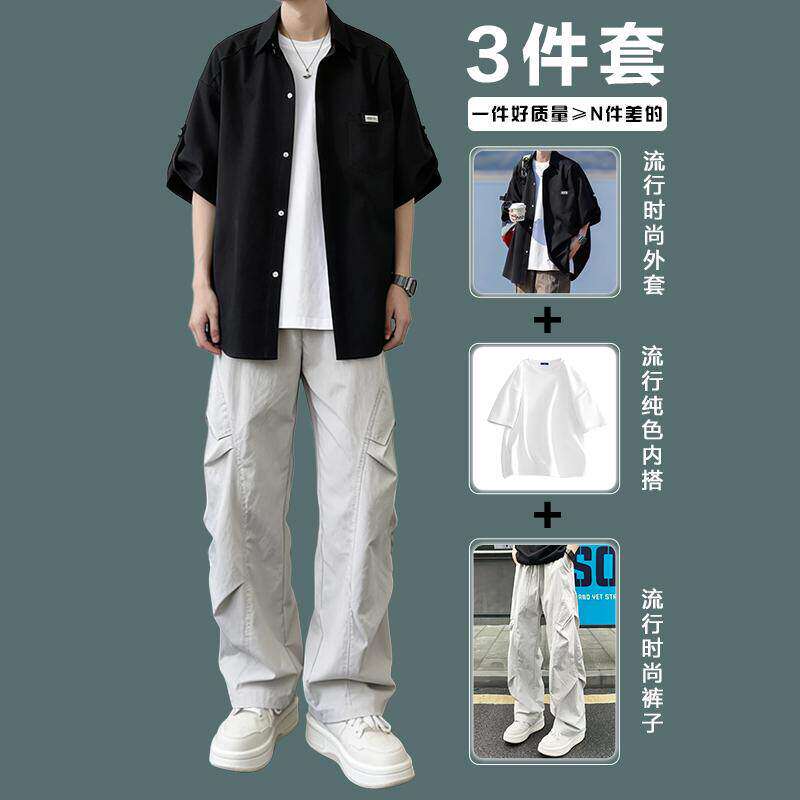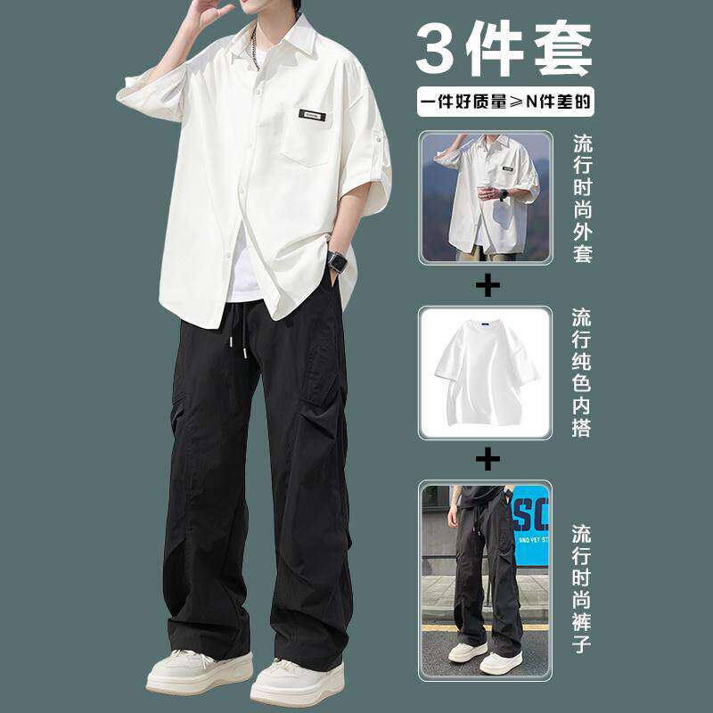 夏季男士短袖冰丝衬衫青少年帅气潮流休闲套装男生酷帅穿搭一整套