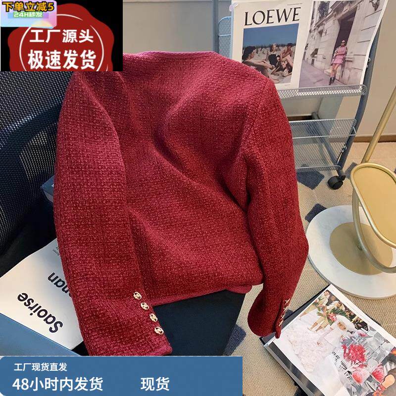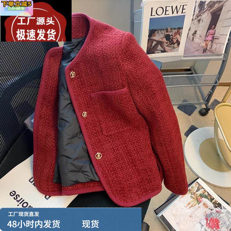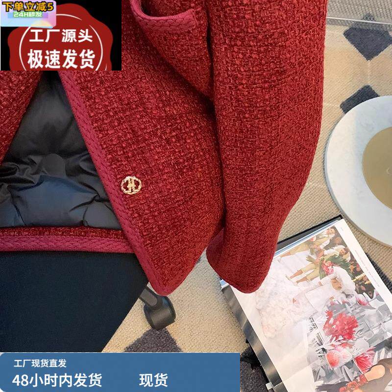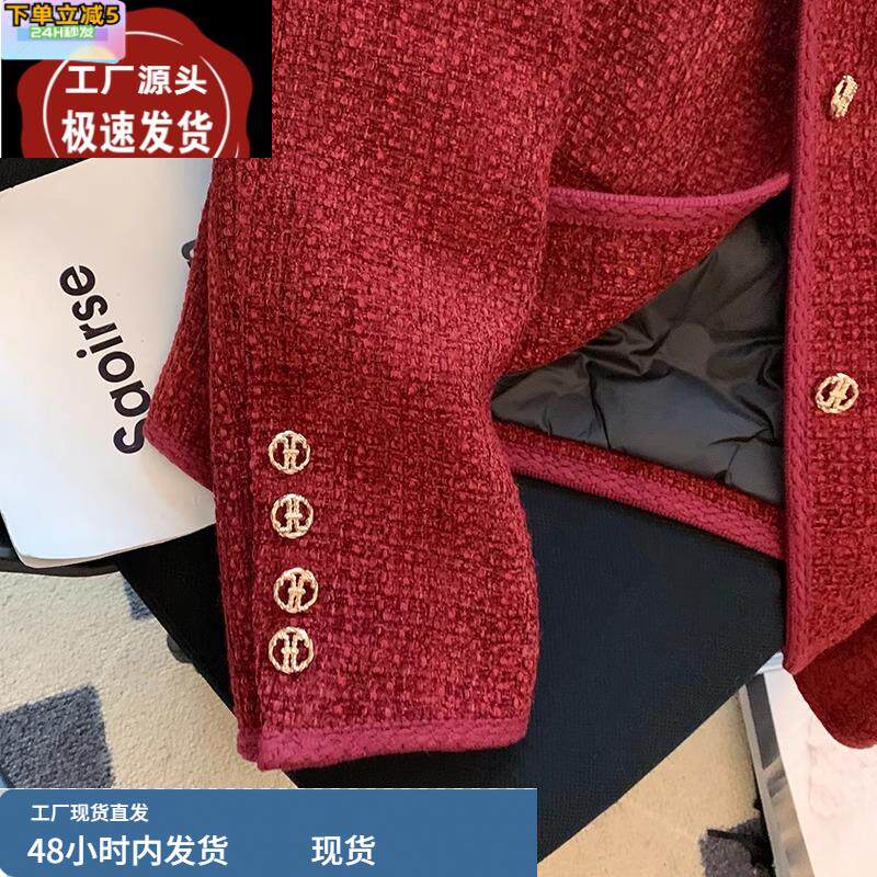 气质名媛红色小香风外套女秋冬2024新款小个子夹棉加厚高级感短款