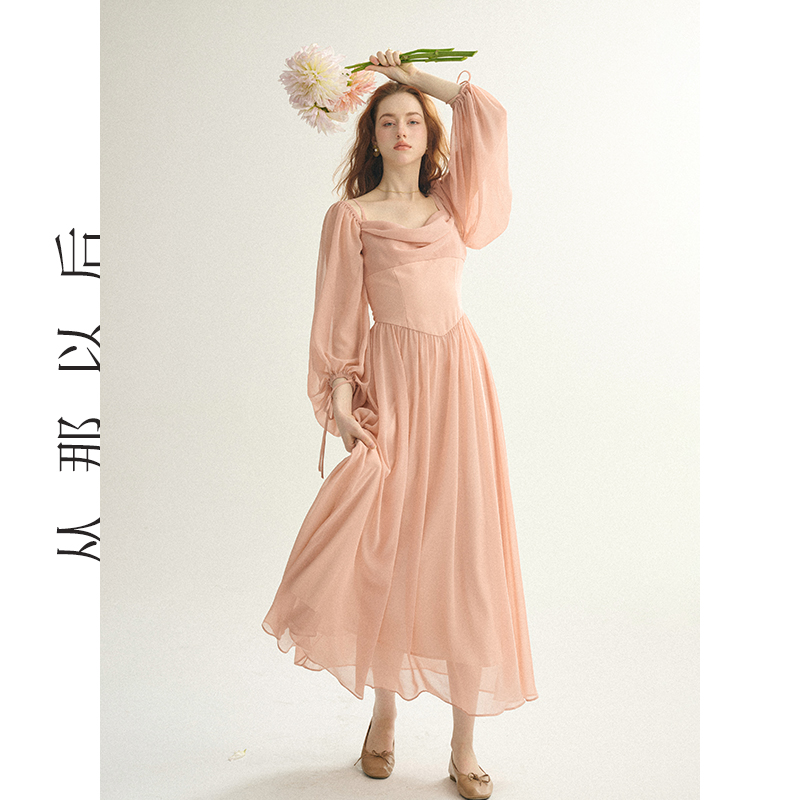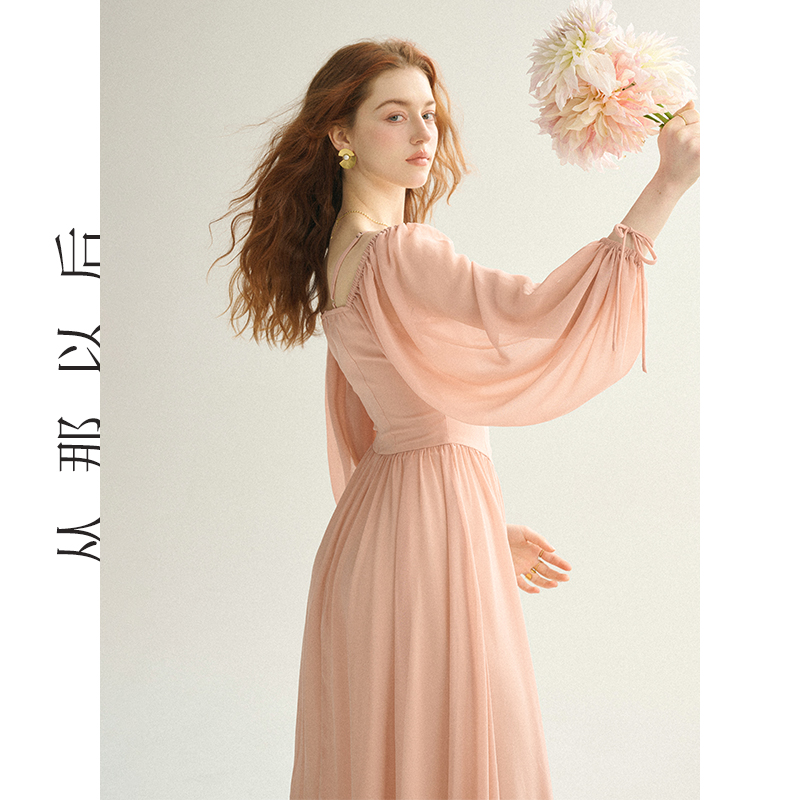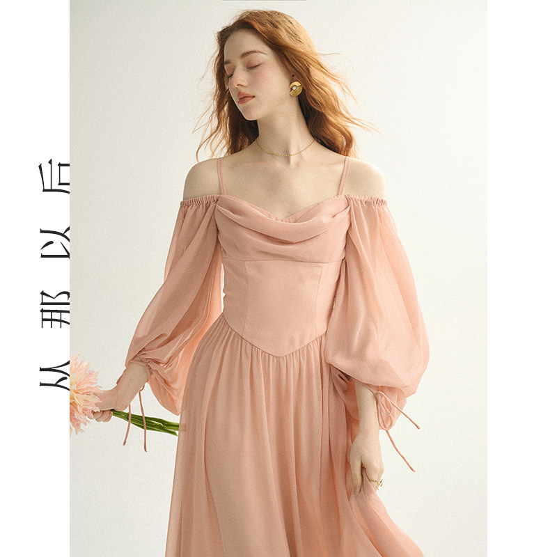 从那以后法式吊带连衣裙粉色高级感长裙长袖礼服裙一字肩小裙子女