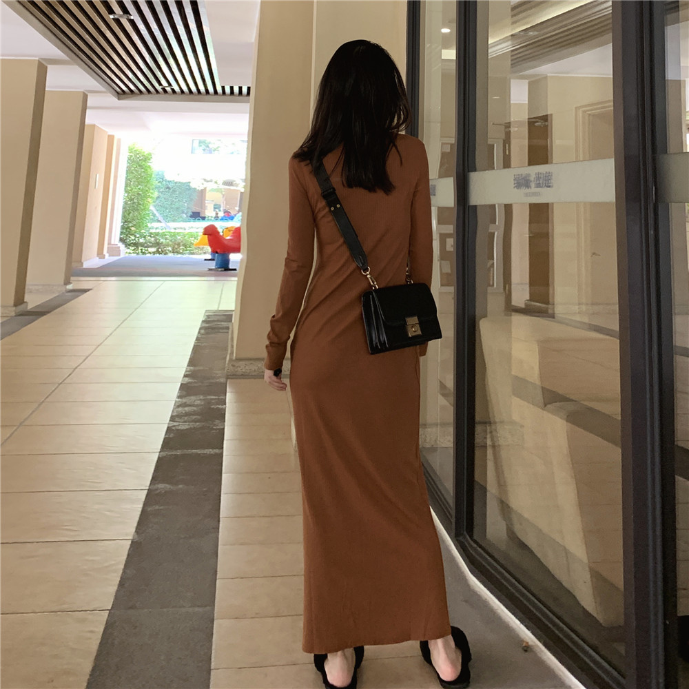超长到脚踝针织连衣裙 螺纹长袖过膝内搭长裙 春秋薄款直筒打底裙