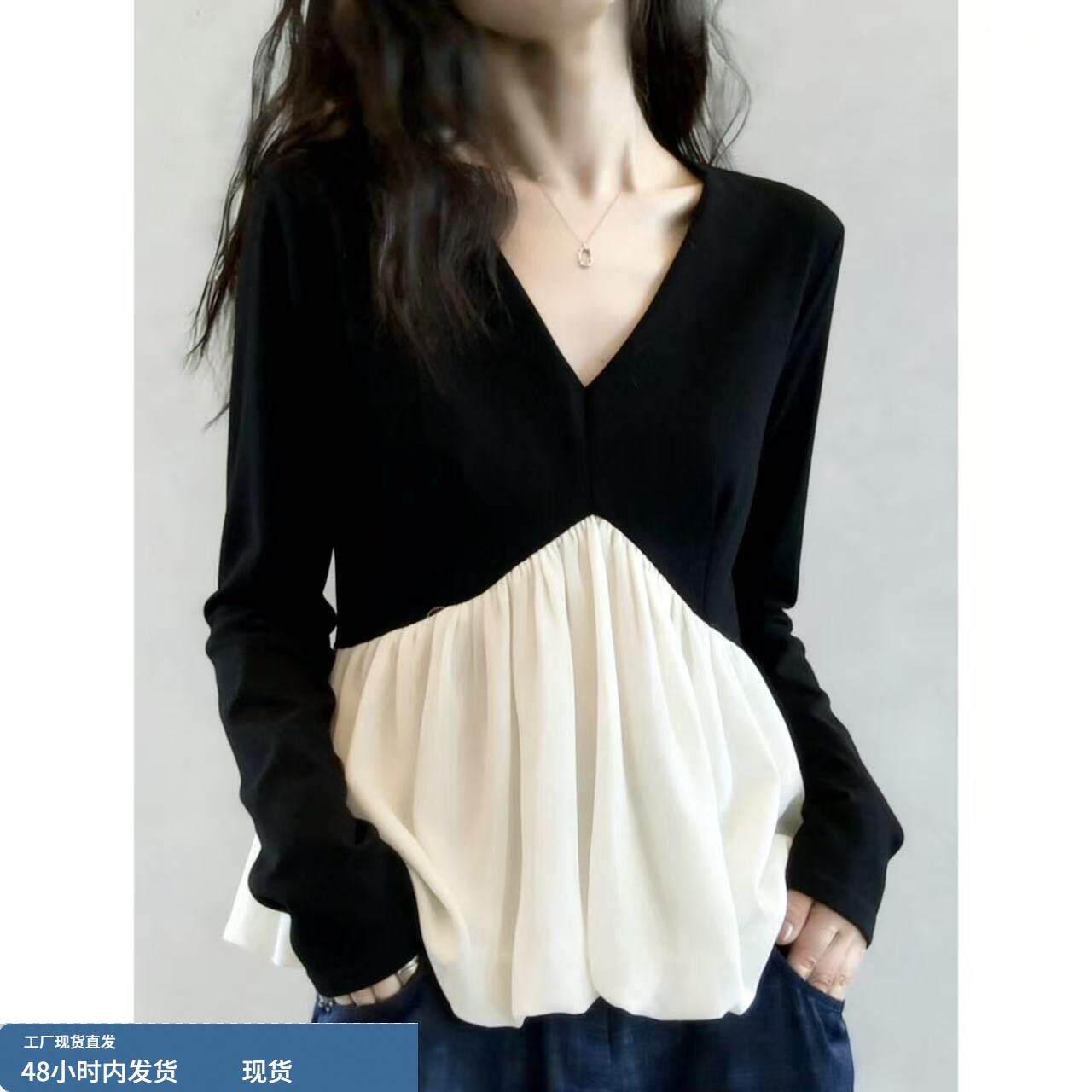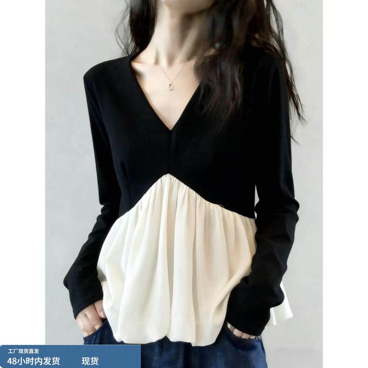 春装女款2026新款法式V领拼接衬衫正肩显瘦遮肚子长袖娃娃衫上衣