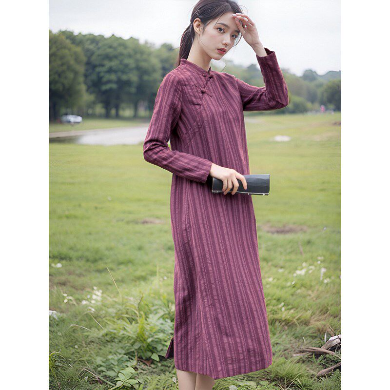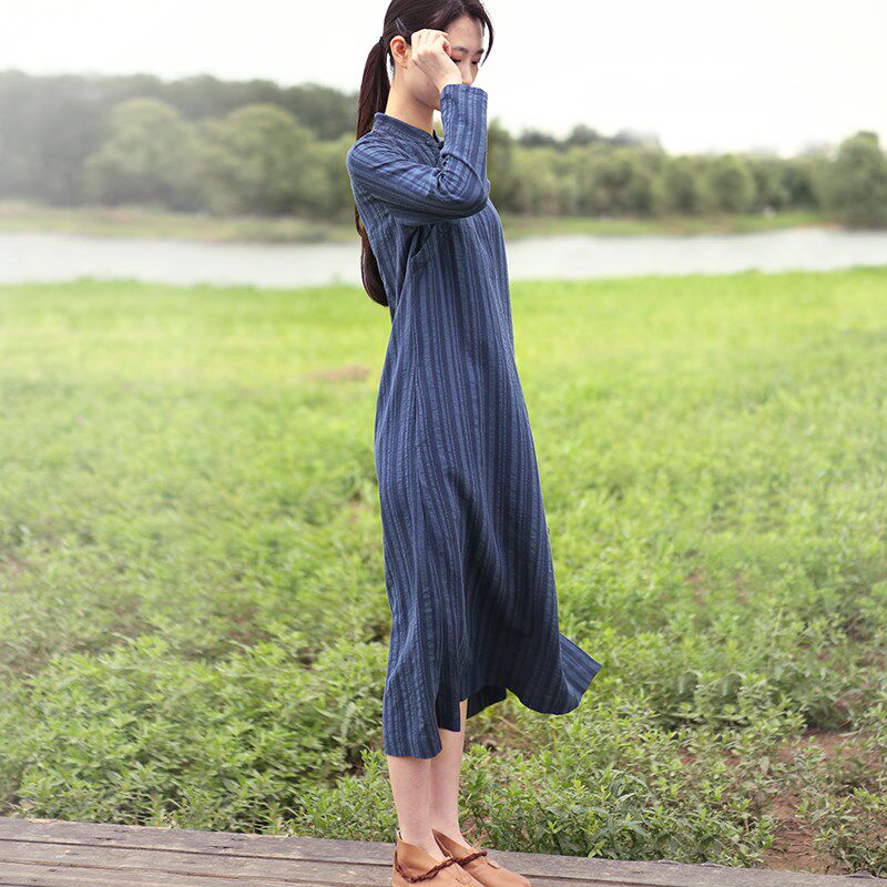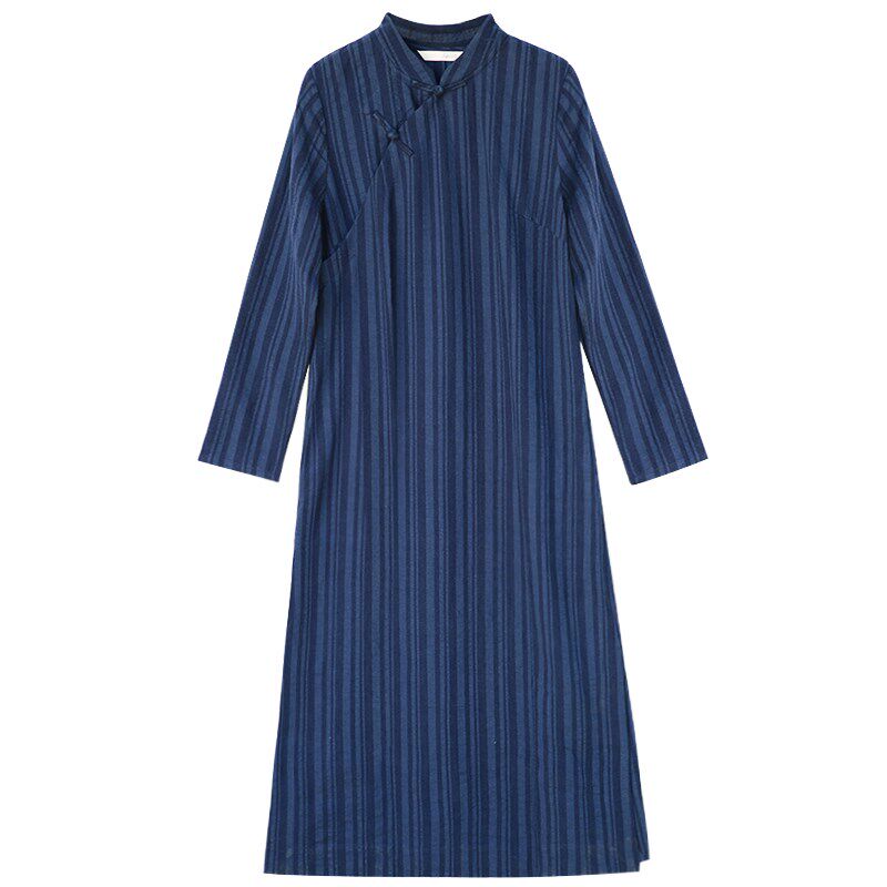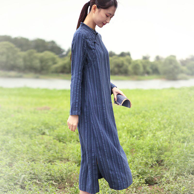 棉麻文艺条纹连衣裙长袖长款春夏中式立领盘扣斜襟旗袍复古显瘦