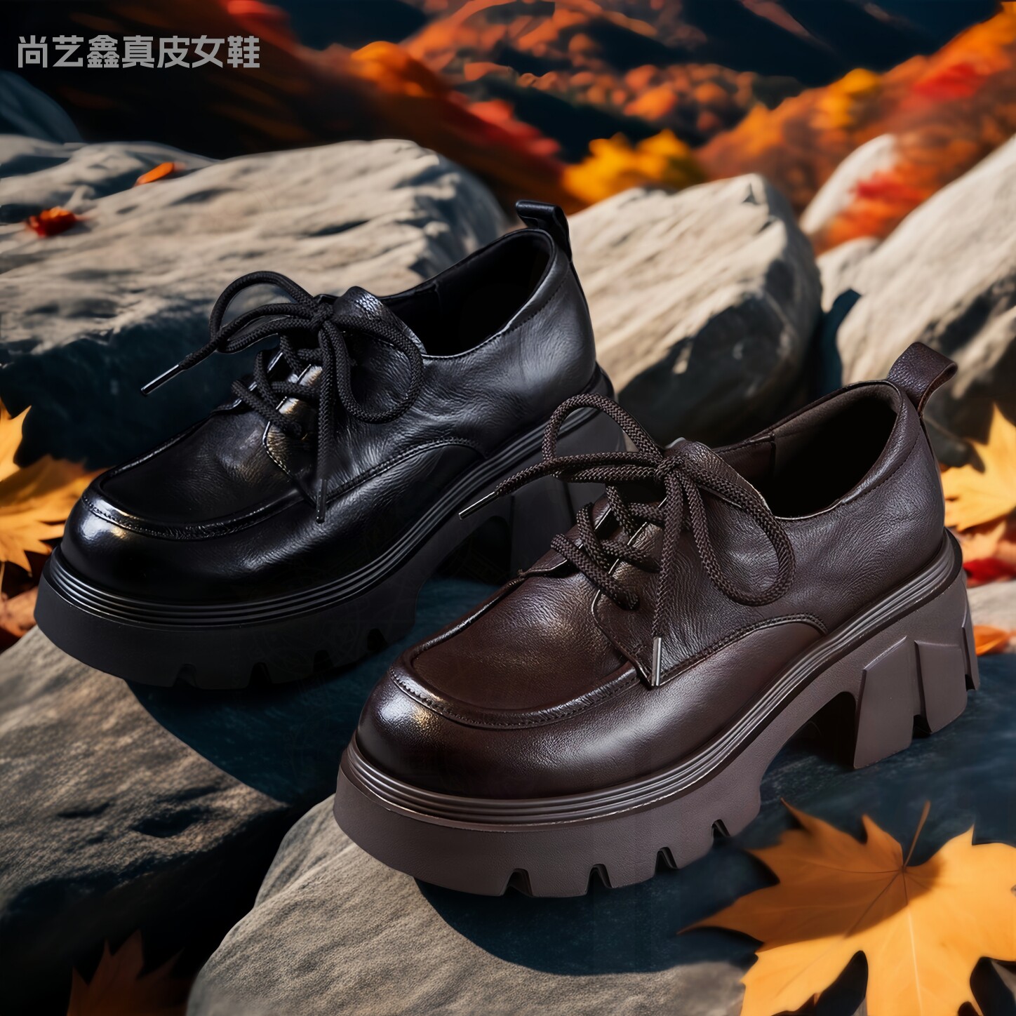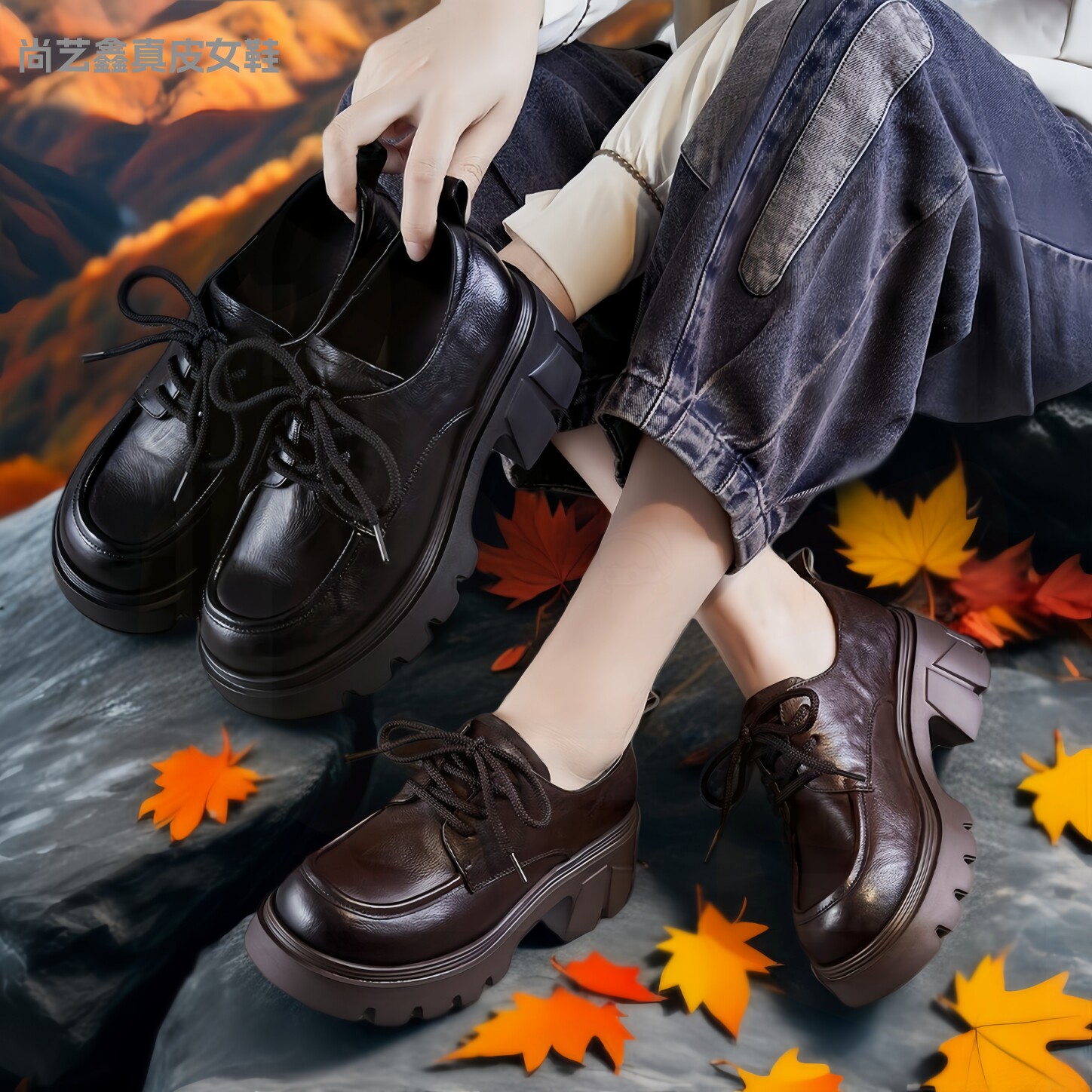 头层牛皮2026春季新款女鞋粗跟舒适厚底增高真皮系带乐福鞋单鞋女