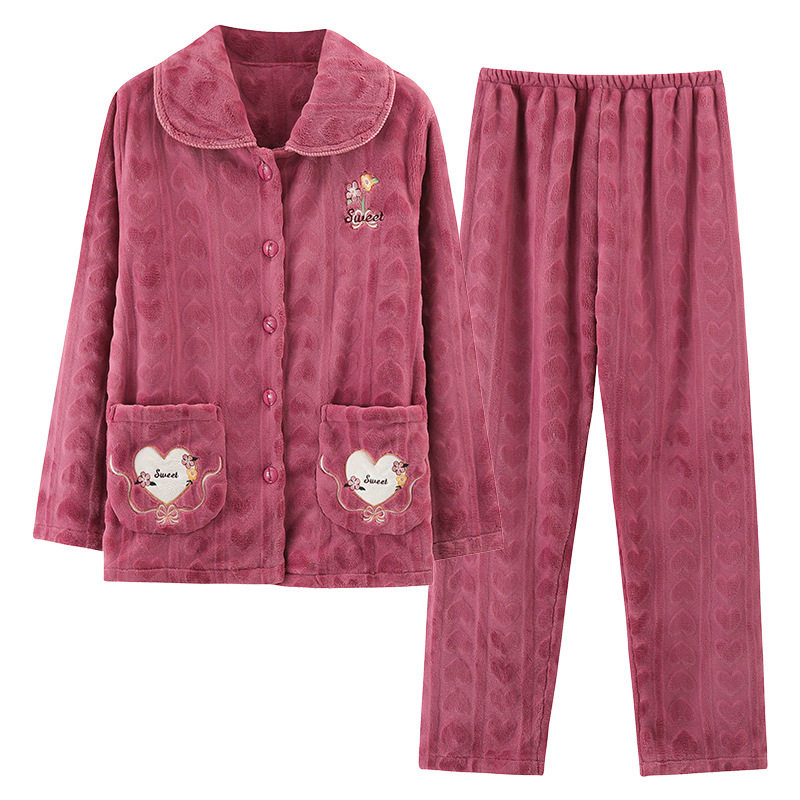 冬季150cm小个子加厚中老年法兰绒睡衣女绣花珊瑚绒老人家居服xs