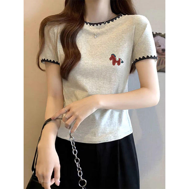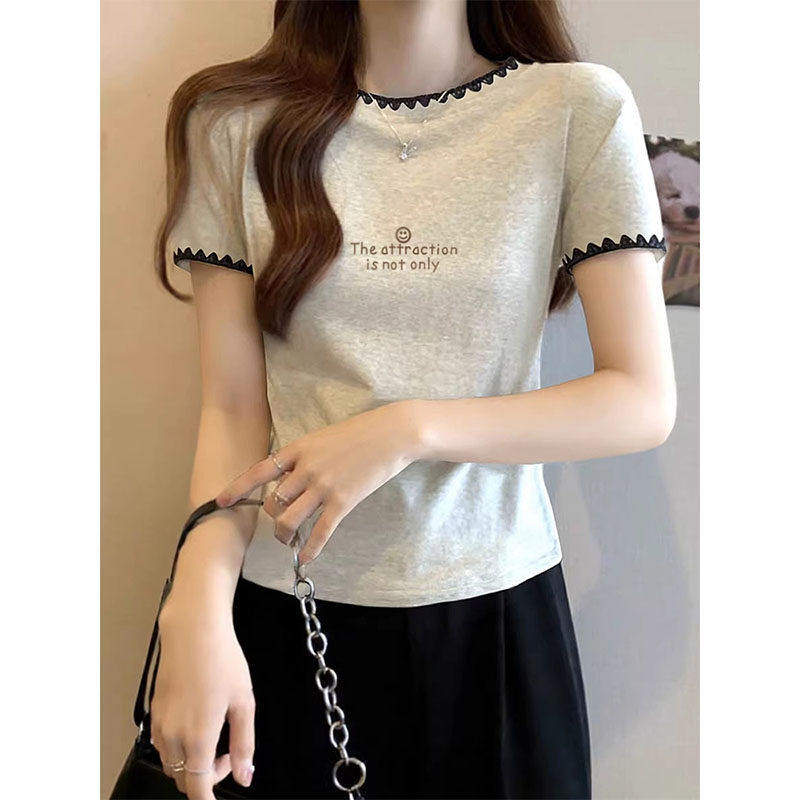 2026夏季新款纯棉米灰色短袖T恤女时尚百搭撞色洋气减龄短款上衣