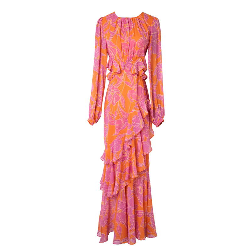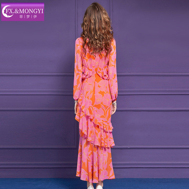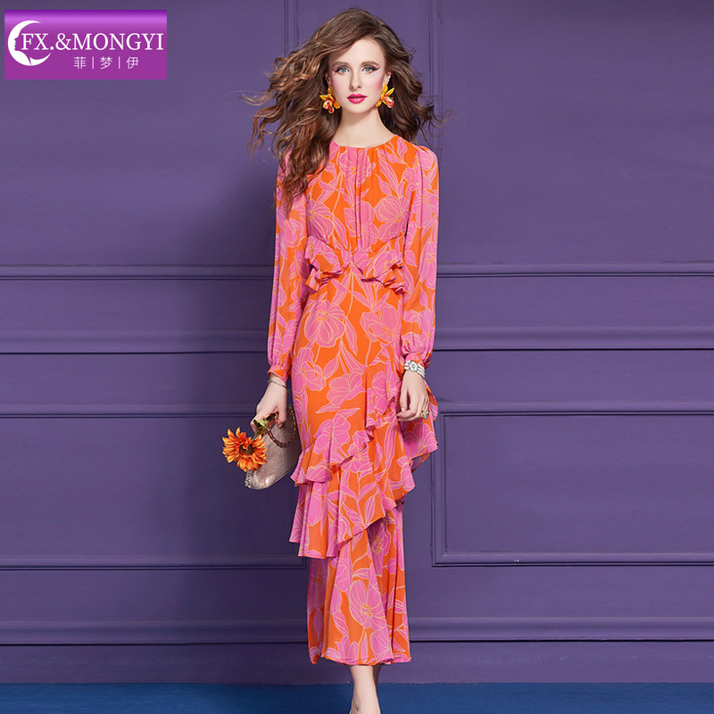 菲梦伊印花连衣裙女长袖春夏新款法式别致设计感荷叶边度假风长裙