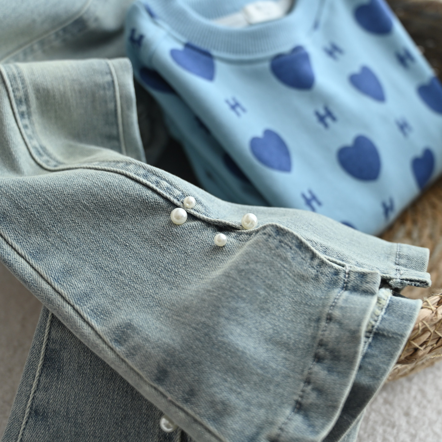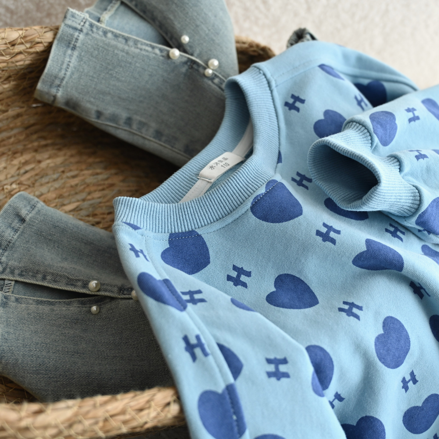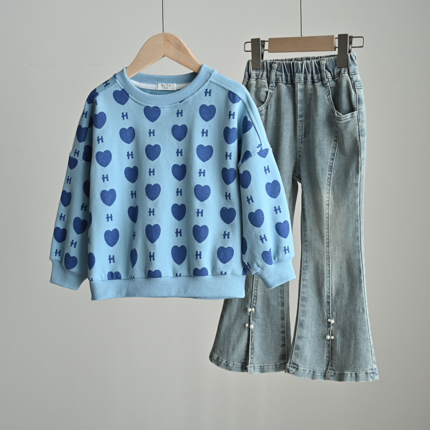 儿童满印爱心圆领毛圈卫衣 女童中大童拼接落肩袖打底衫上衣 春款