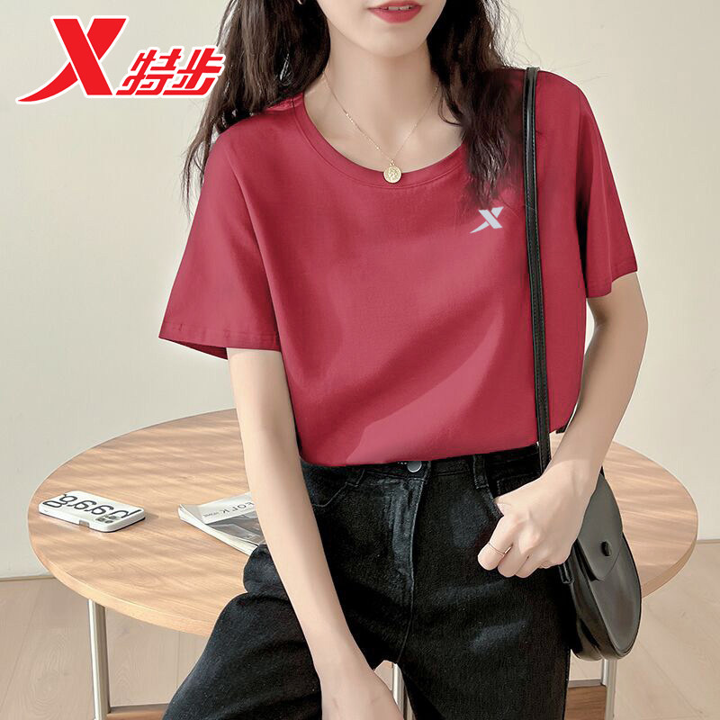 特步短袖T恤女款纯棉2026新款春季宽松上衣跑步休闲打底半袖运动t