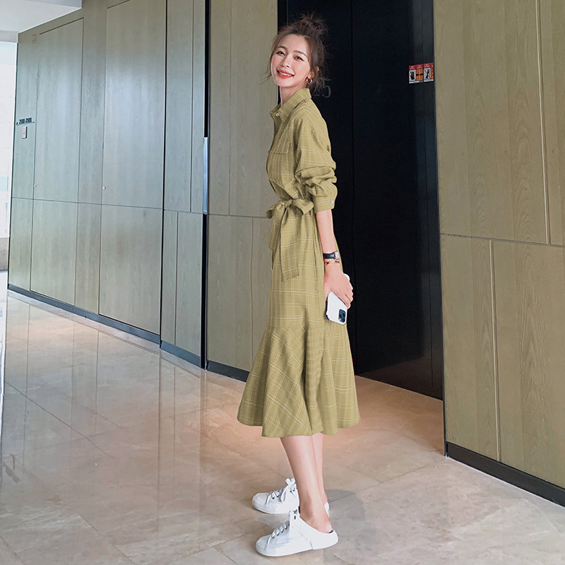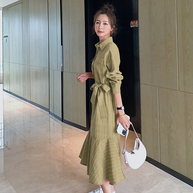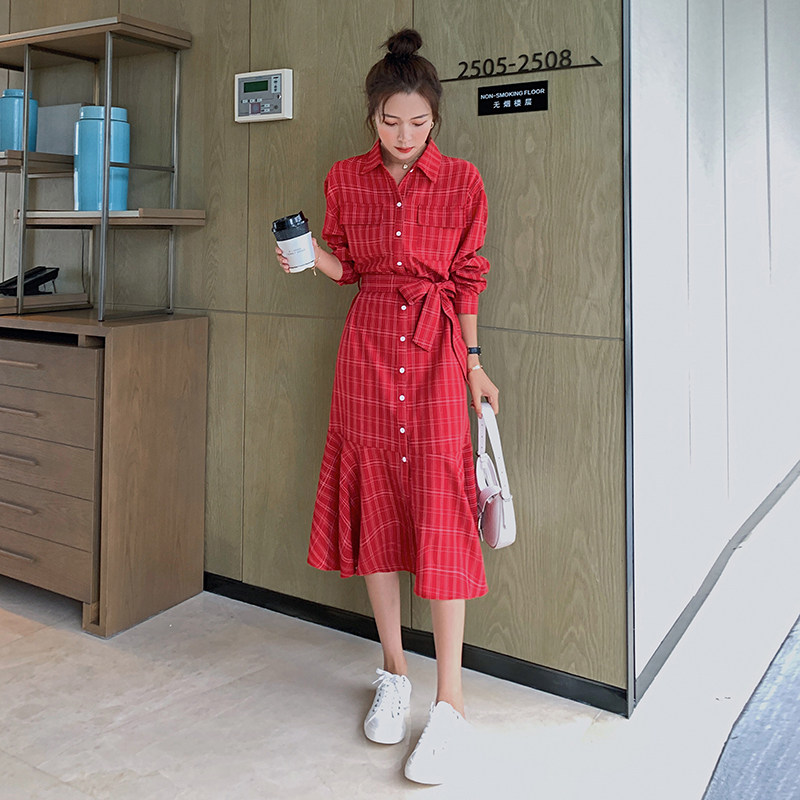 格子连衣裙女春秋长袖红色长裙鱼尾裙茶歇法式雪纺衬衫裙韩版宽松