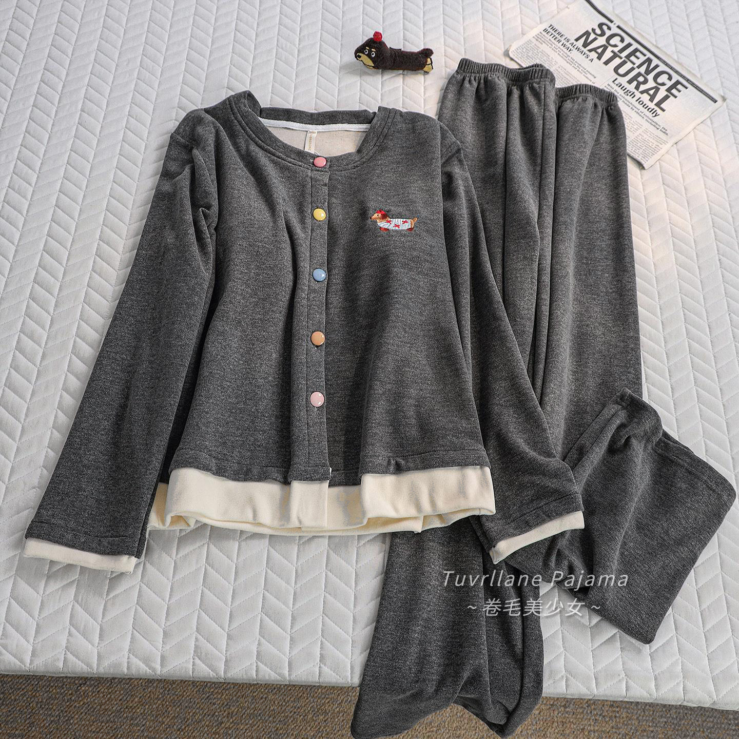 可外穿带胸垫加厚德绒保暖睡衣女秋冬季慵懒风羊绒棉家居服套装