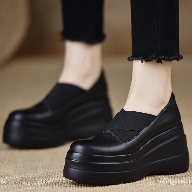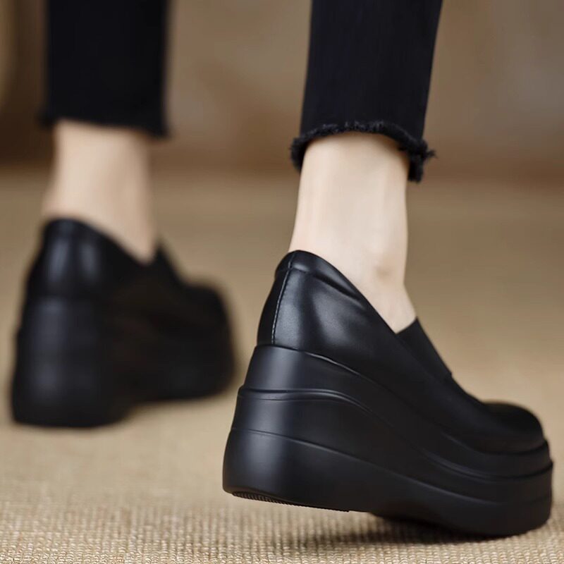 真皮厚底坡跟单鞋女春秋季新款圆头防水台高跟鞋粗跟小个子乐福鞋