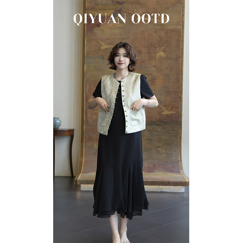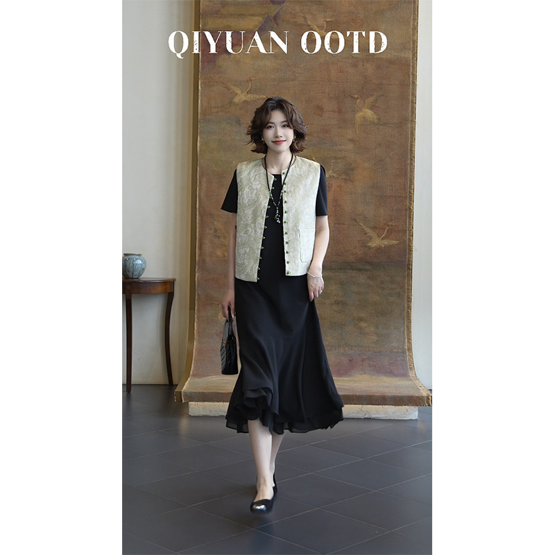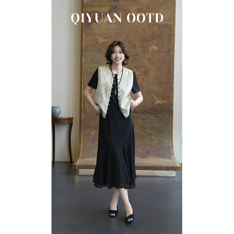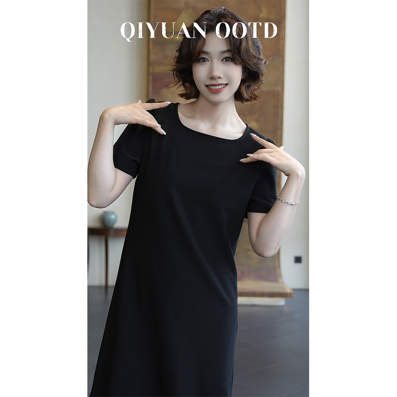 柒院家大码女网纱拼接鱼尾短袖连衣裙2026春夏新款通勤宽松中长裙