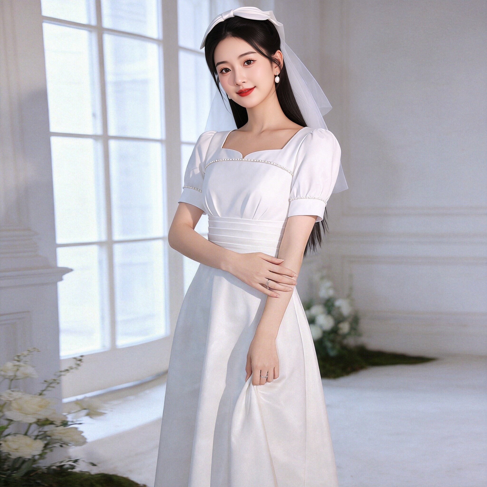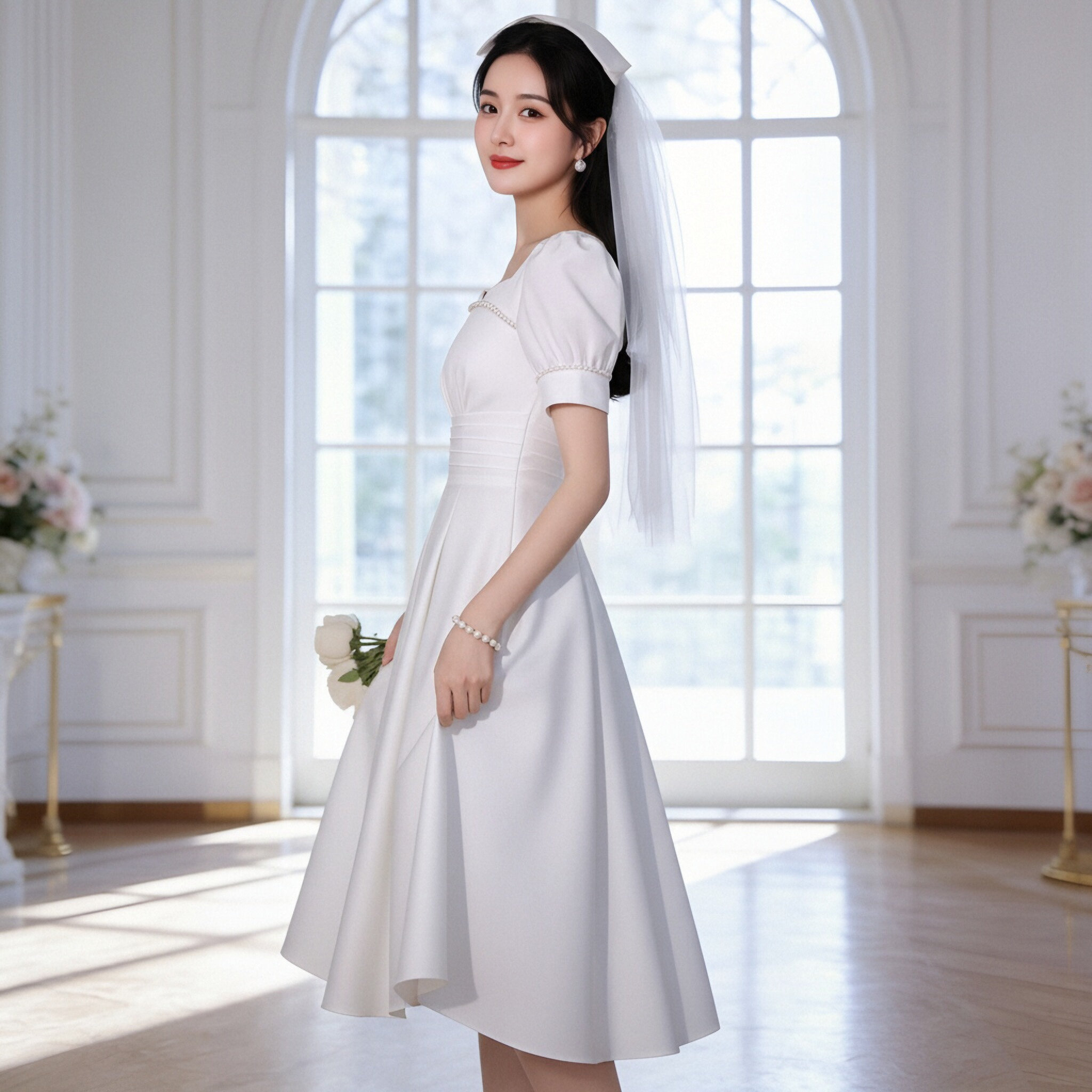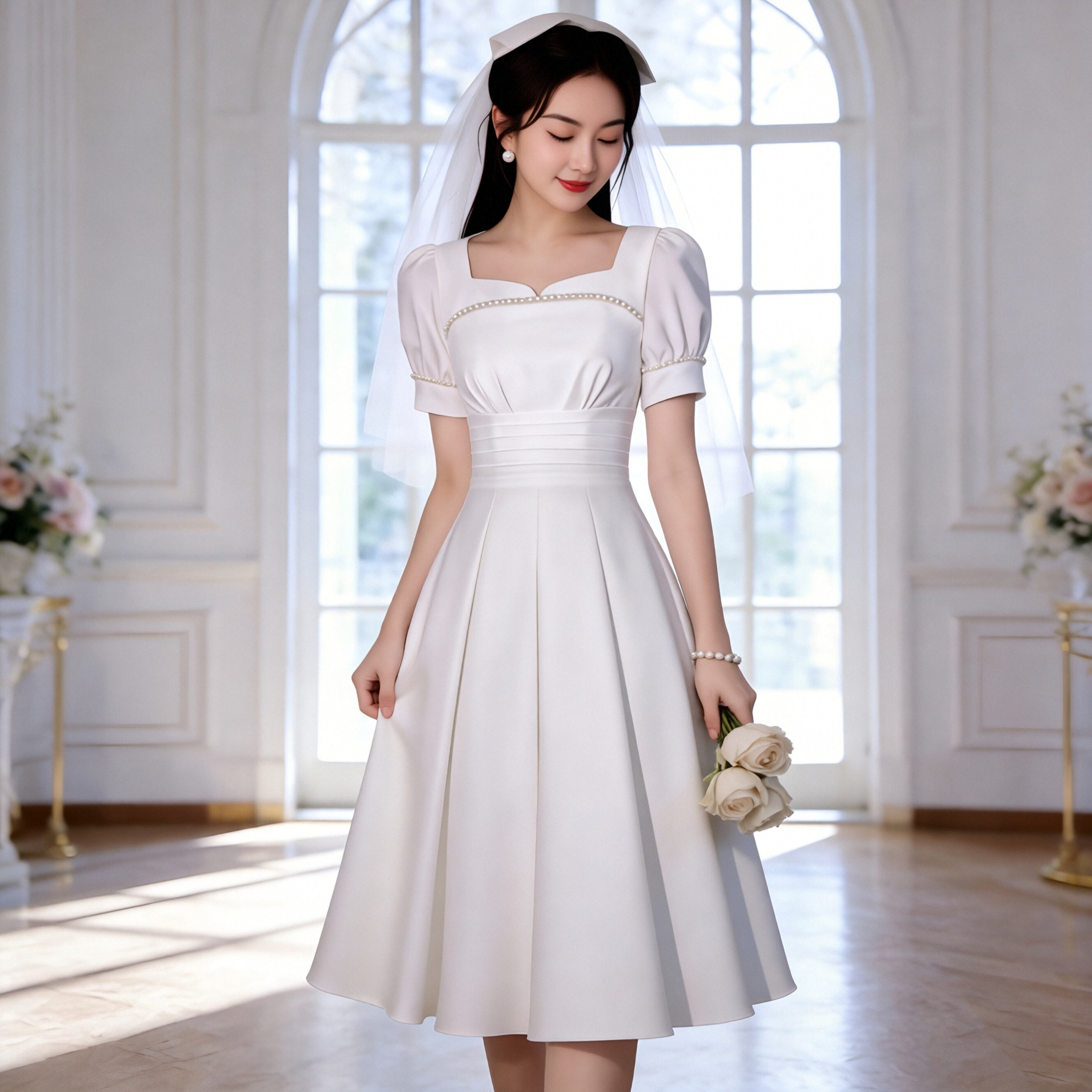 法式温柔风白色方领泡泡袖A字连衣裙女收腰小个子订婚短袖小白裙