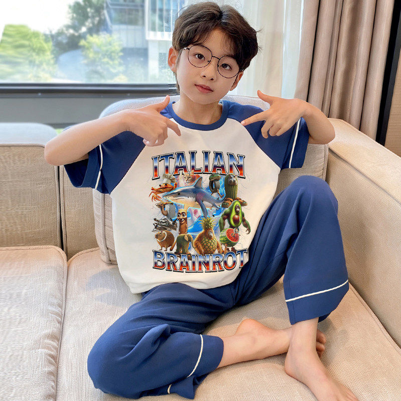 男童睡衣春夏季纯棉薄款短袖长裤青少年男孩大童可外穿家居服套装