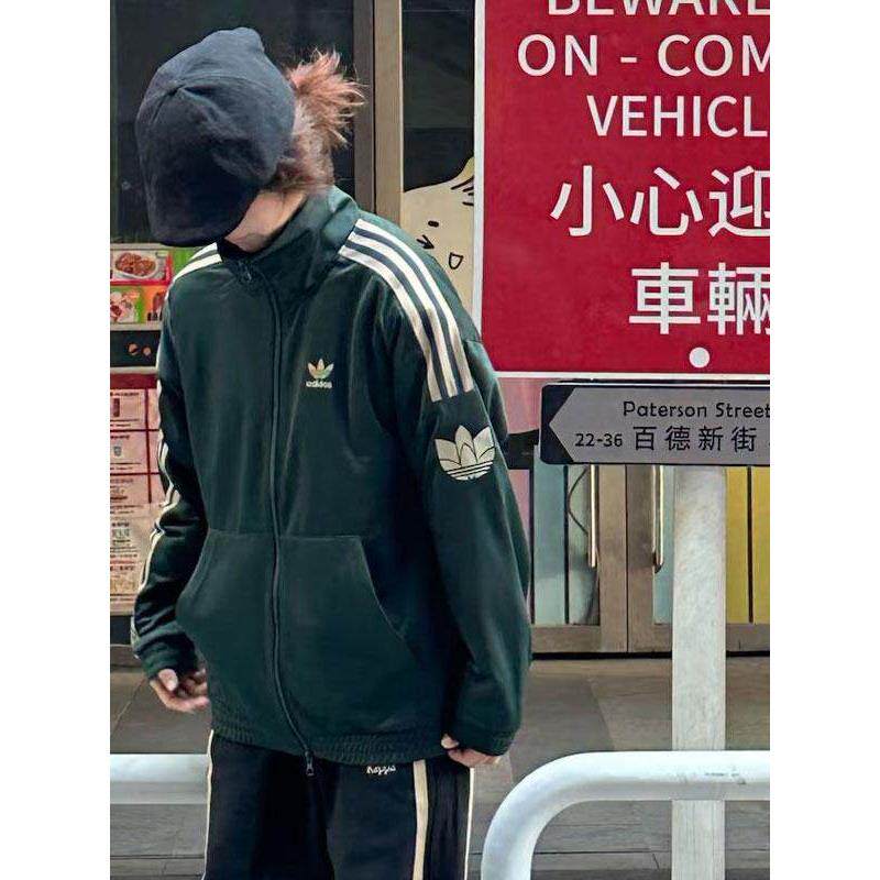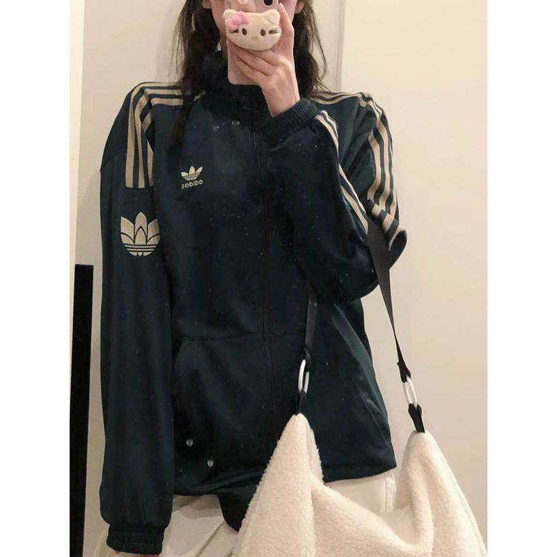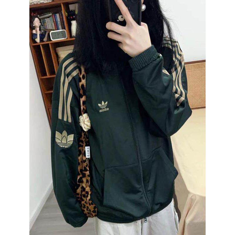 阿迪达斯三叶草绿色外套女春季新款宽松大码运动美式夹克开衫上衣