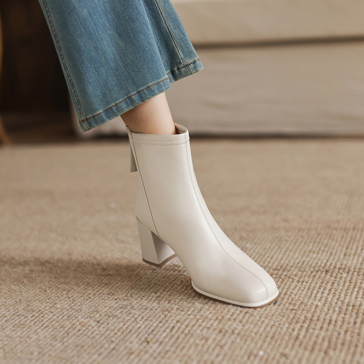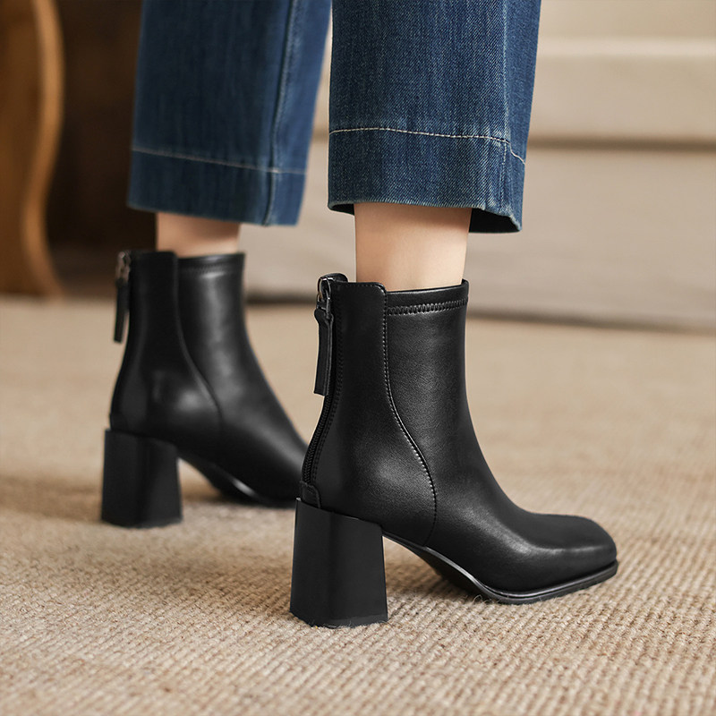 阿么手工女鞋冬季加绒法式高跟短靴女保暖白色真皮方头瘦瘦靴7CM