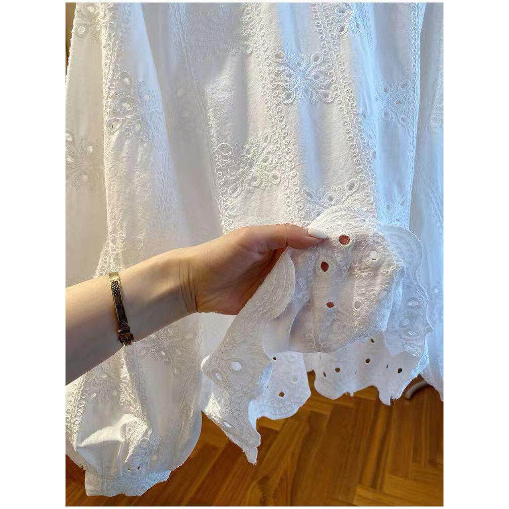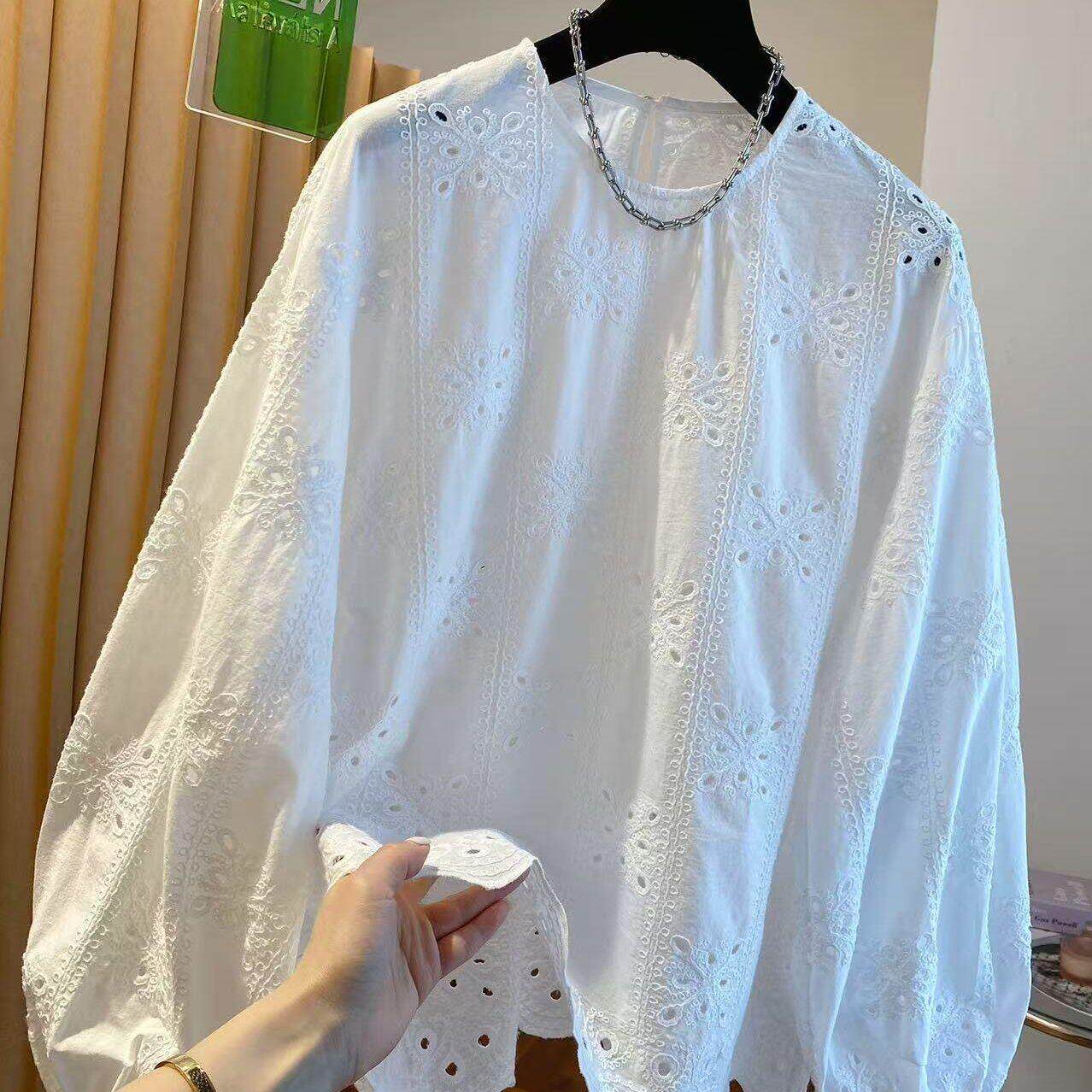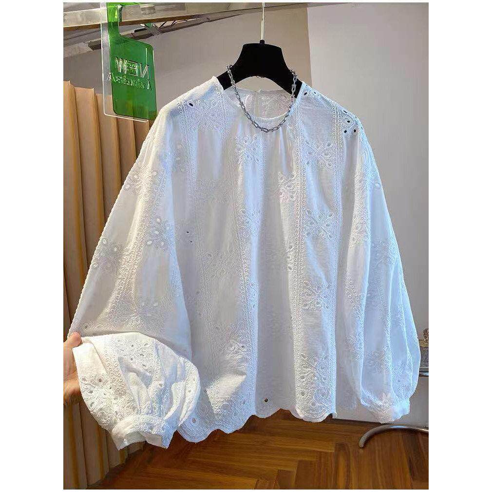 春装女款2026年新款白色镂空蕾丝衬衫长袖宽松圆领洋气高级感上衣