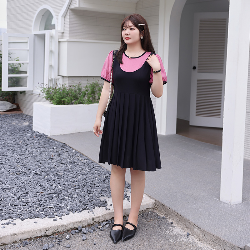 大码胖MM百褶背带裙假两件套装2023年夏季新款时尚百搭显瘦连衣裙