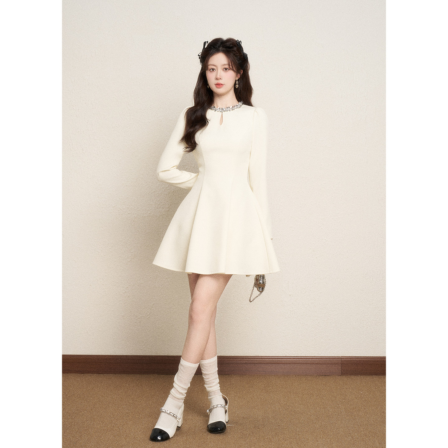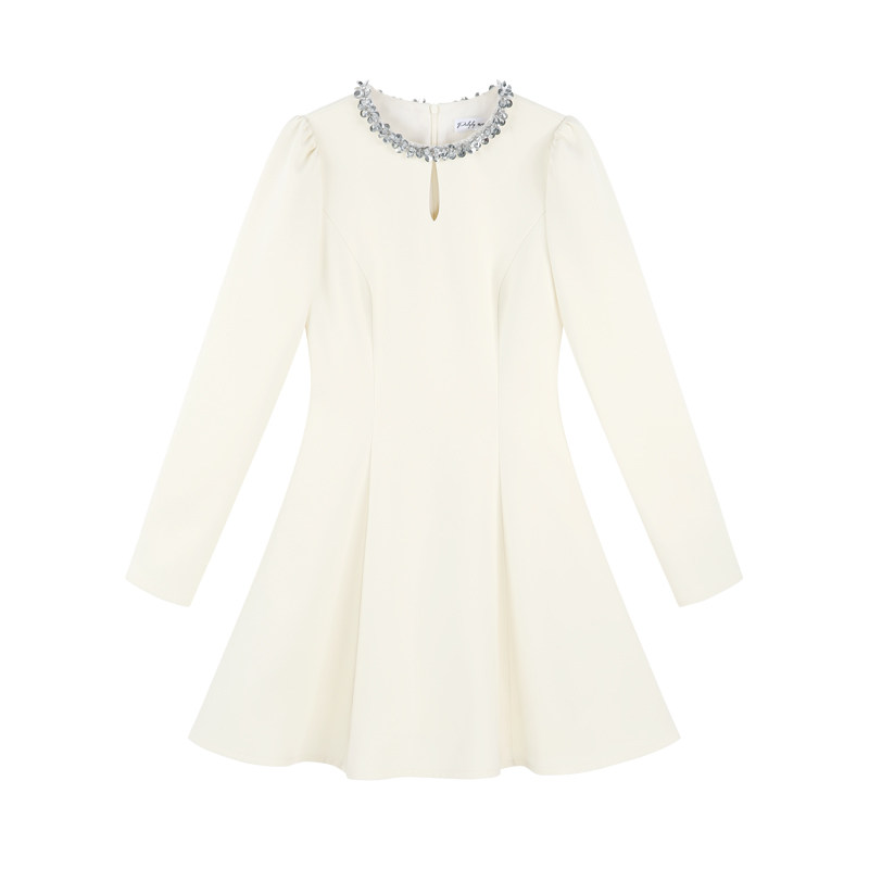 311线报网描述:亮片重工杏色法式连衣裙女秋冬2025新款