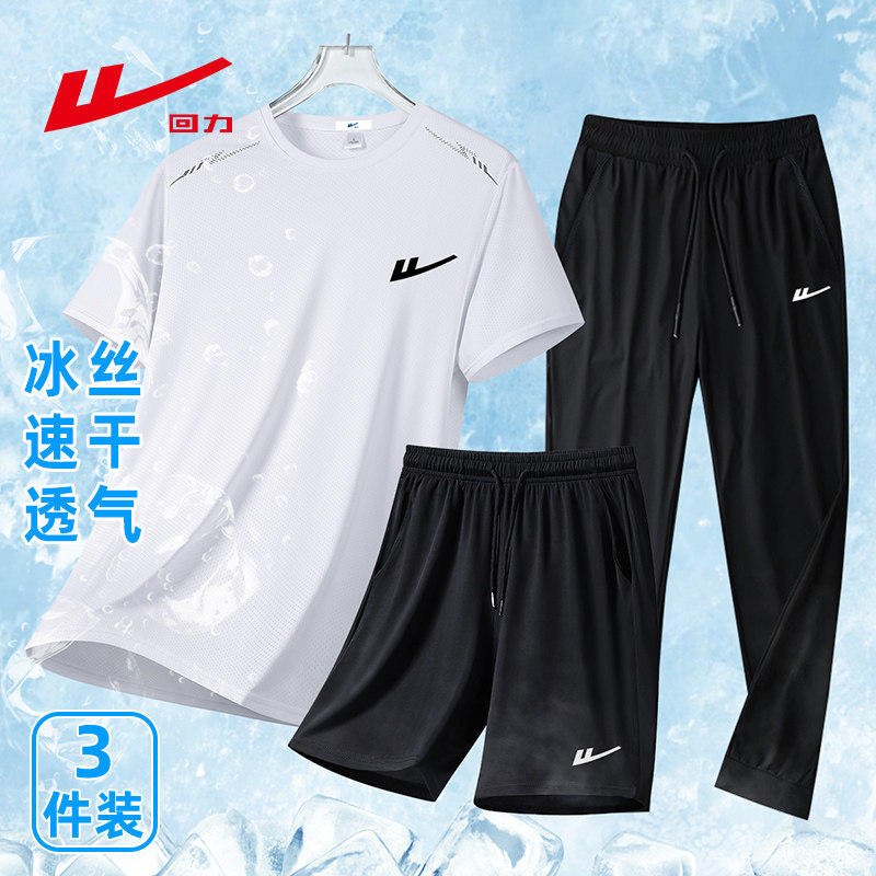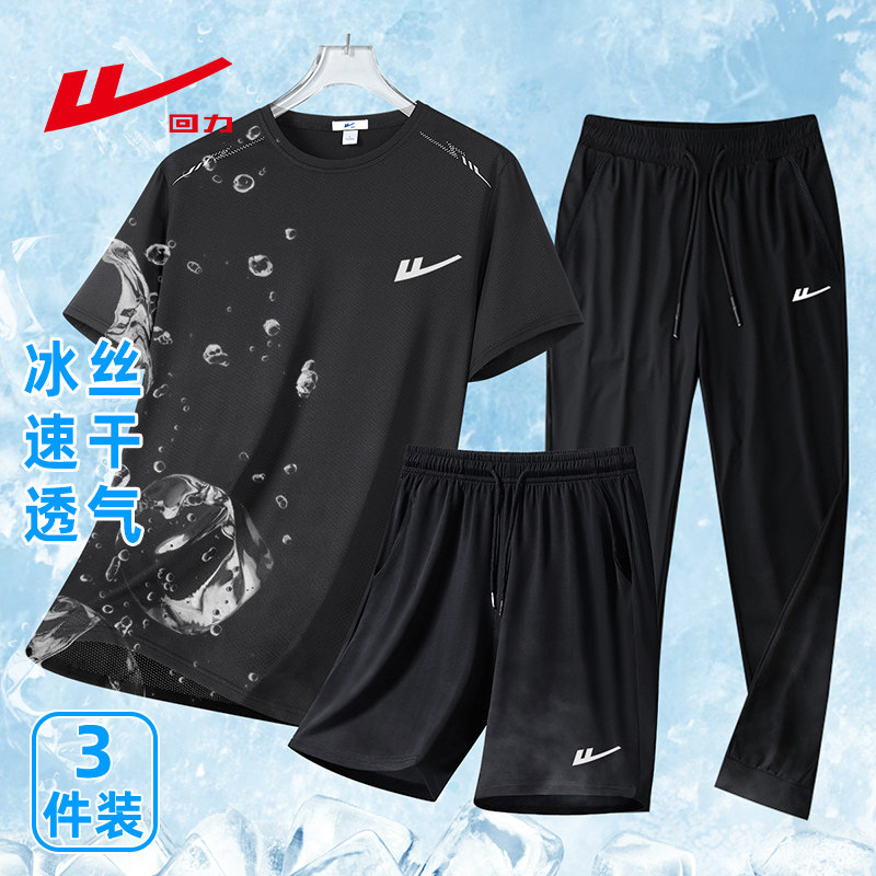回力运动套装男士夏季冰丝速干短袖透气跑步训练健身房衣服三件套