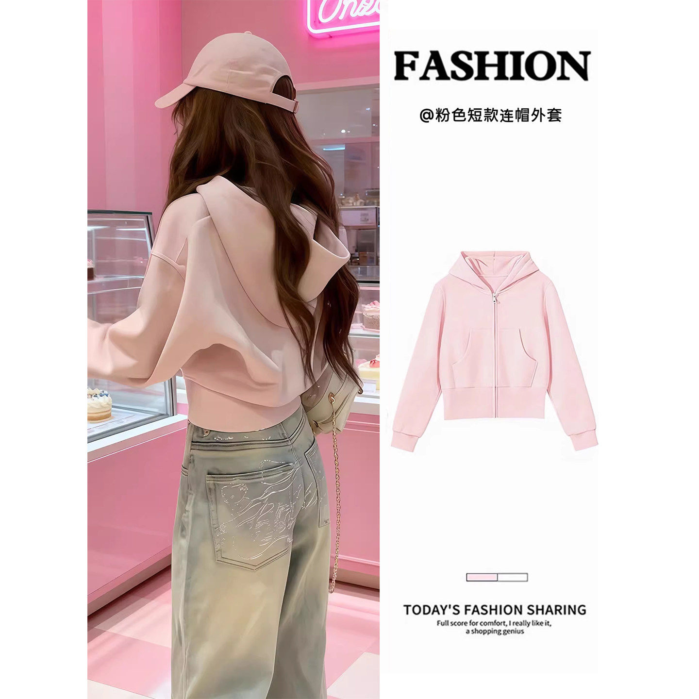 粉色短款卫衣外套女款春秋正肩连帽修身收腰上衣薄韩系早春季穿搭