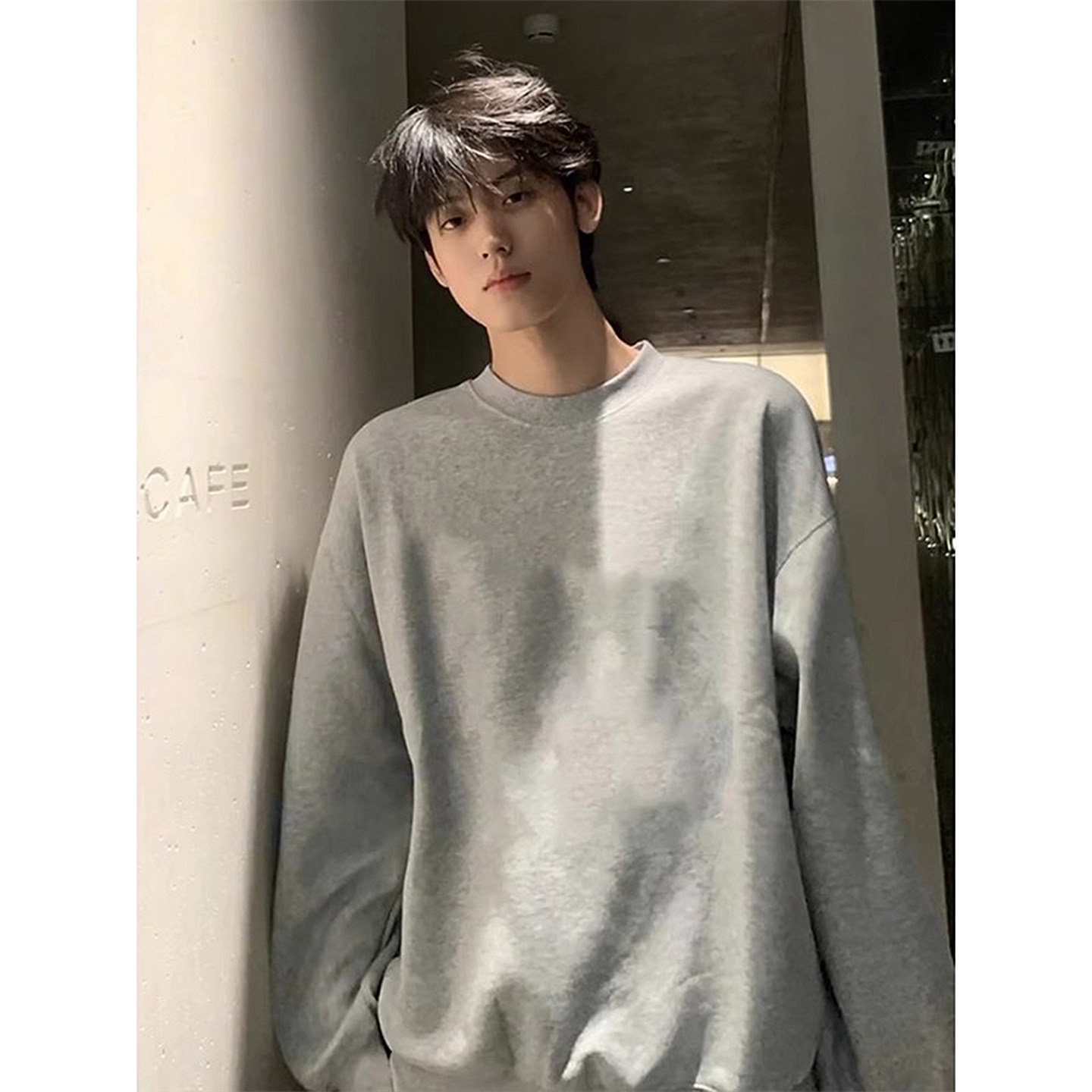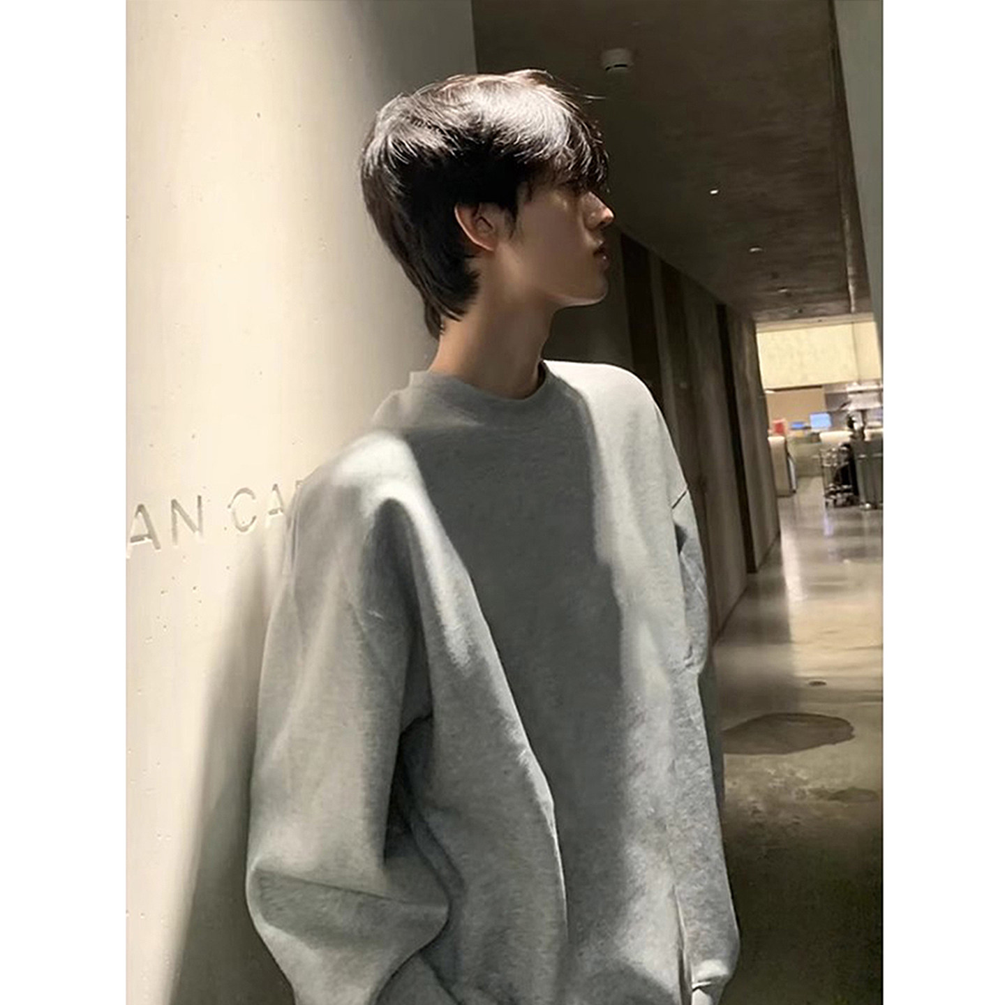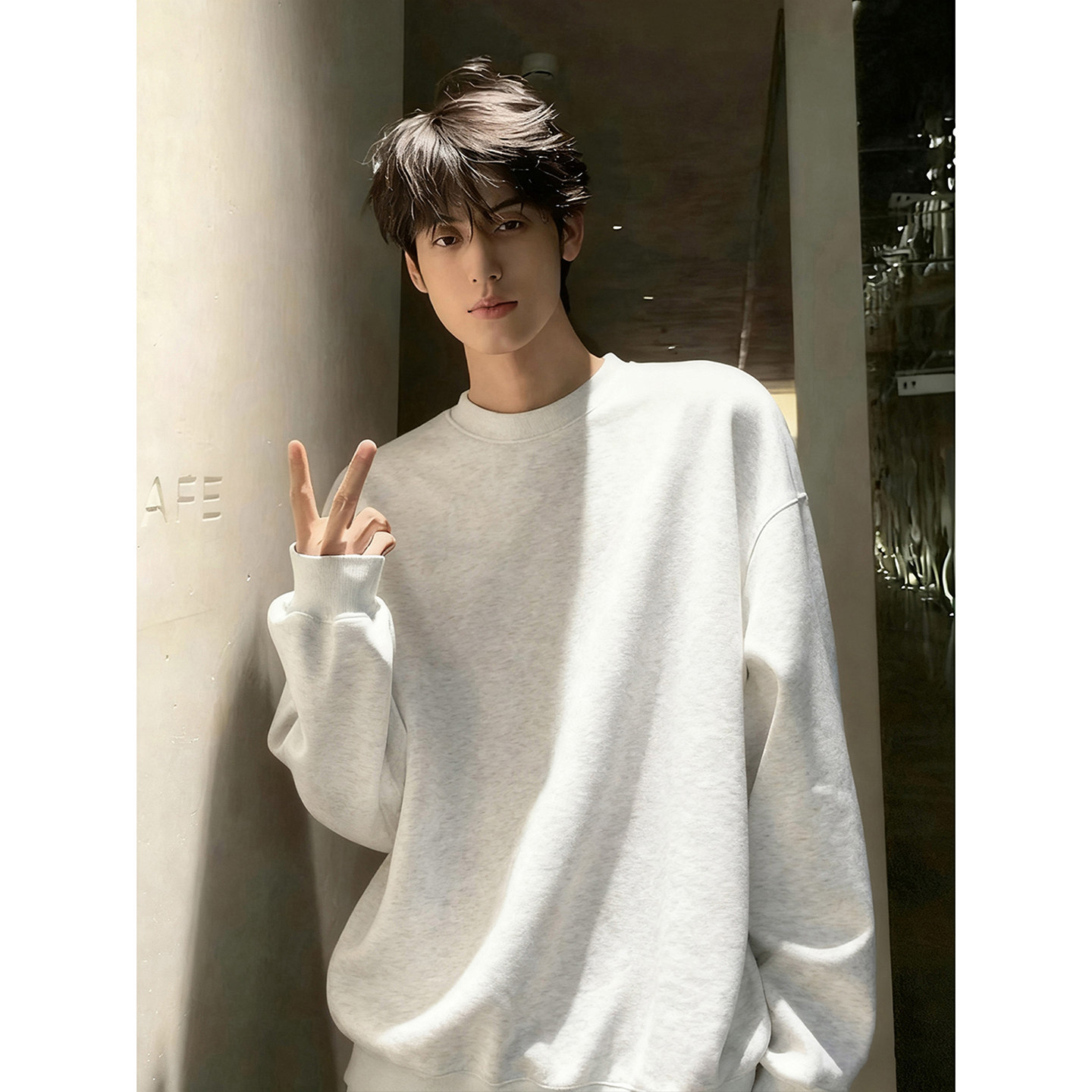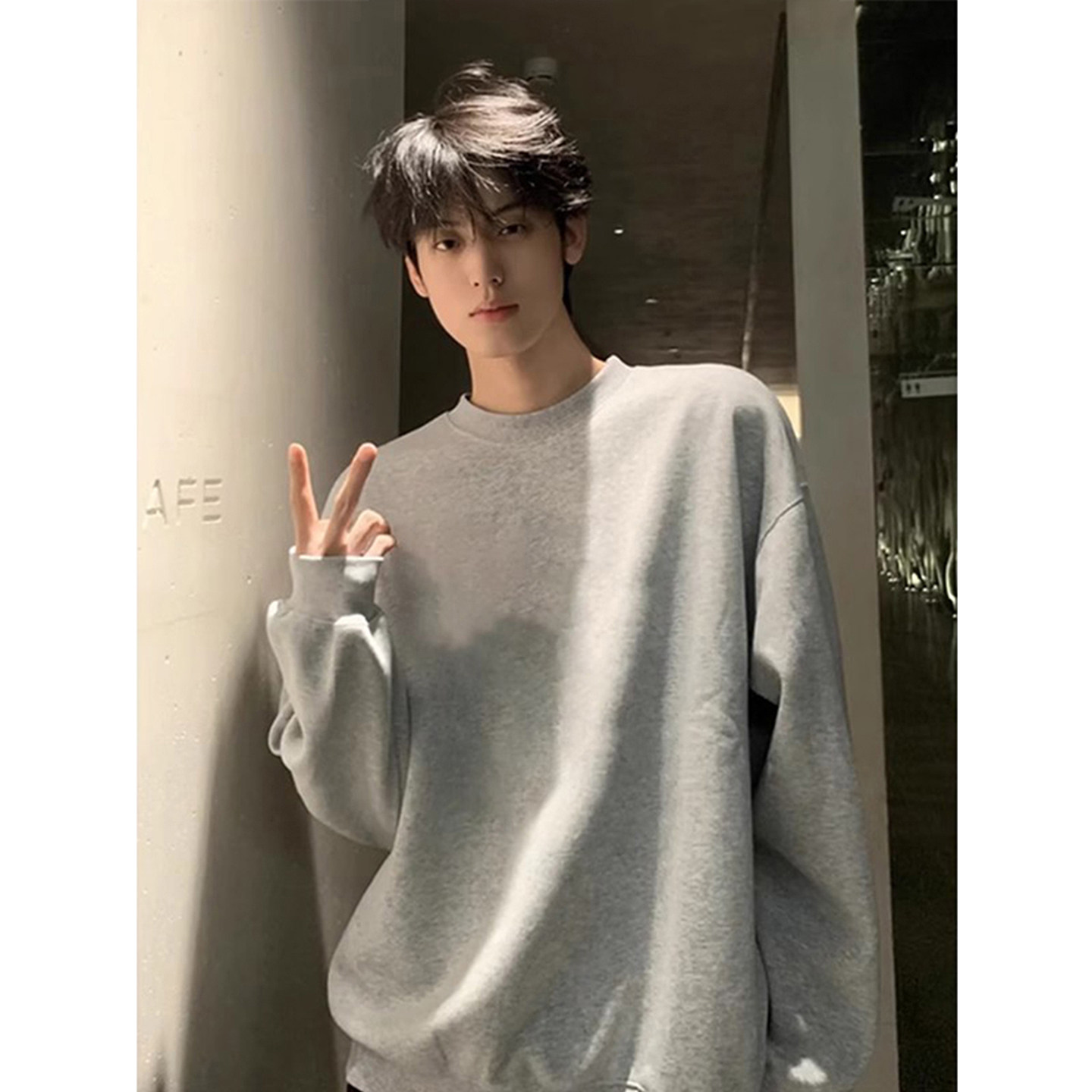 美式高街黑色痞帅加绒纯色圆领卫衣男款冬季宽松情侣款内搭打底衫