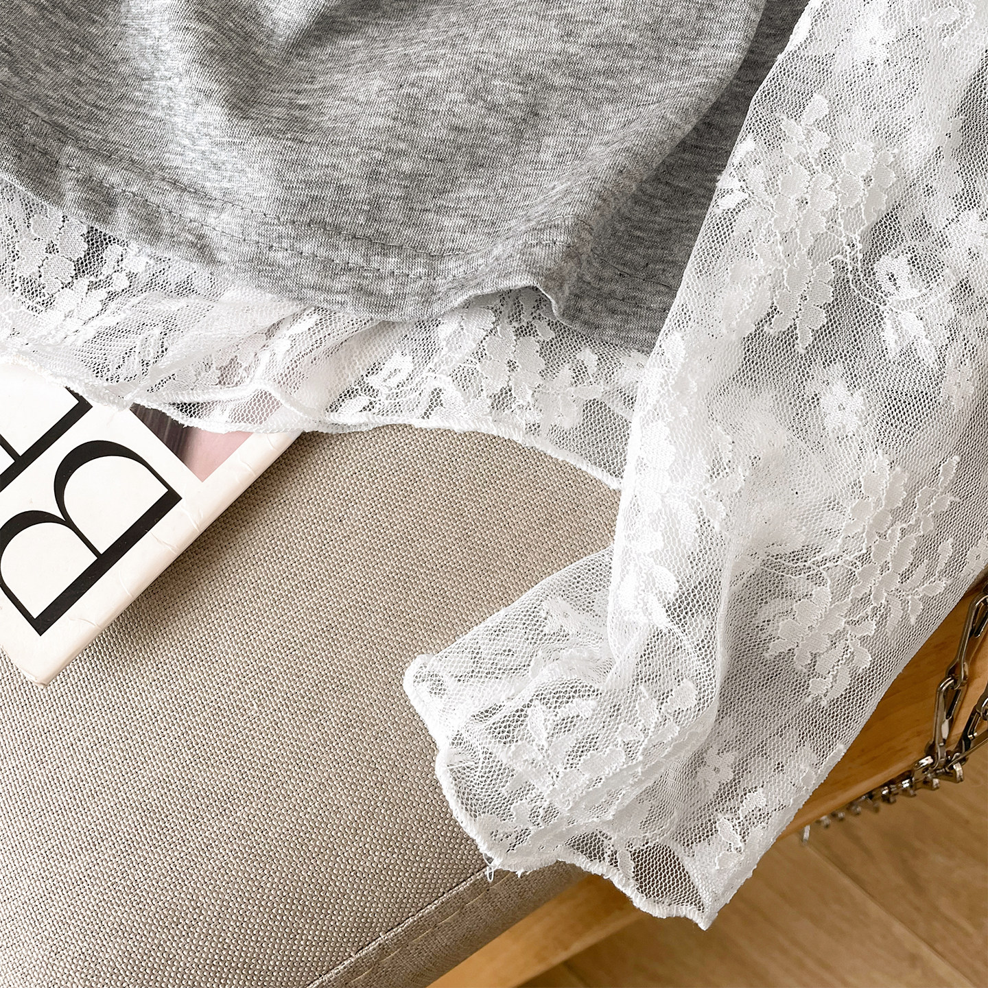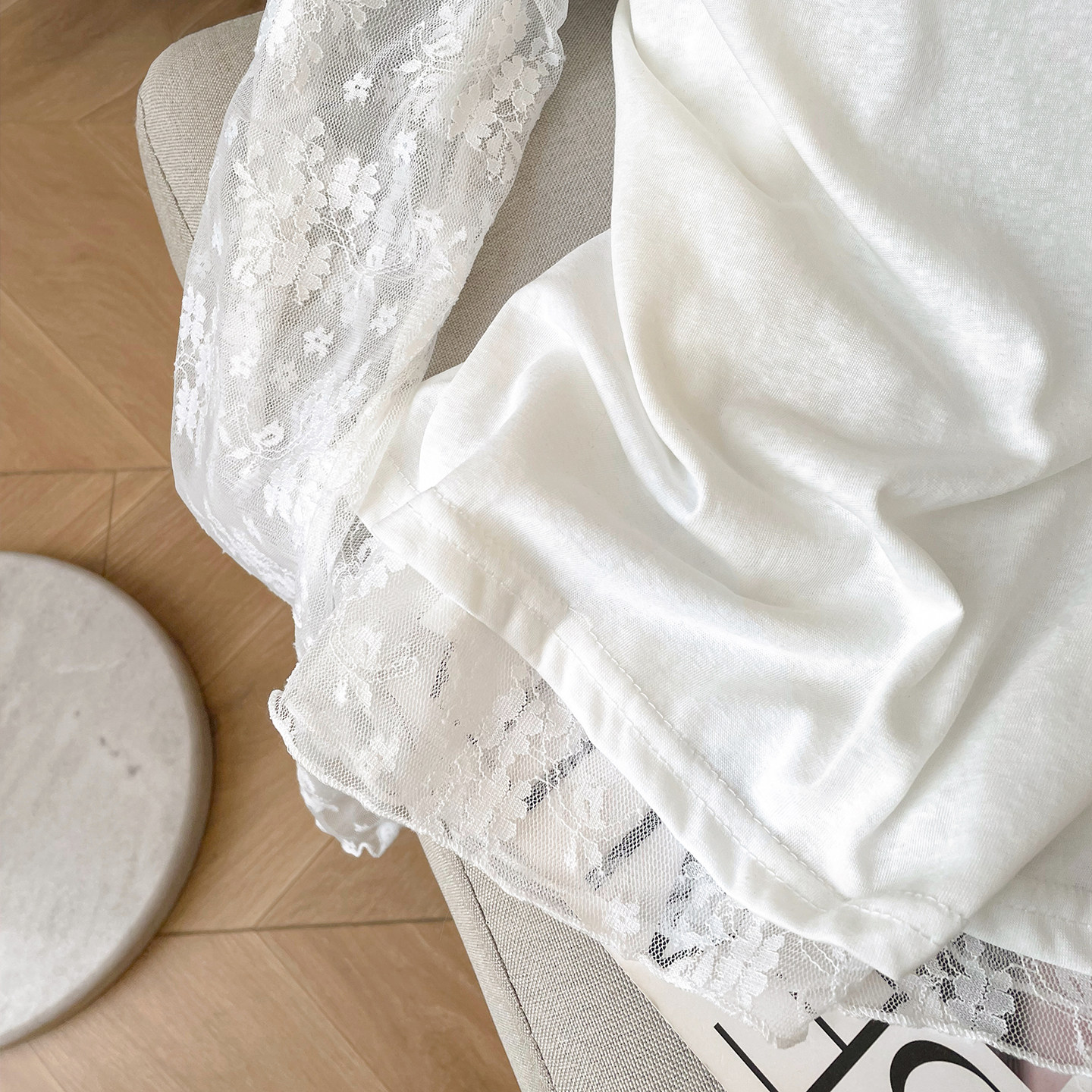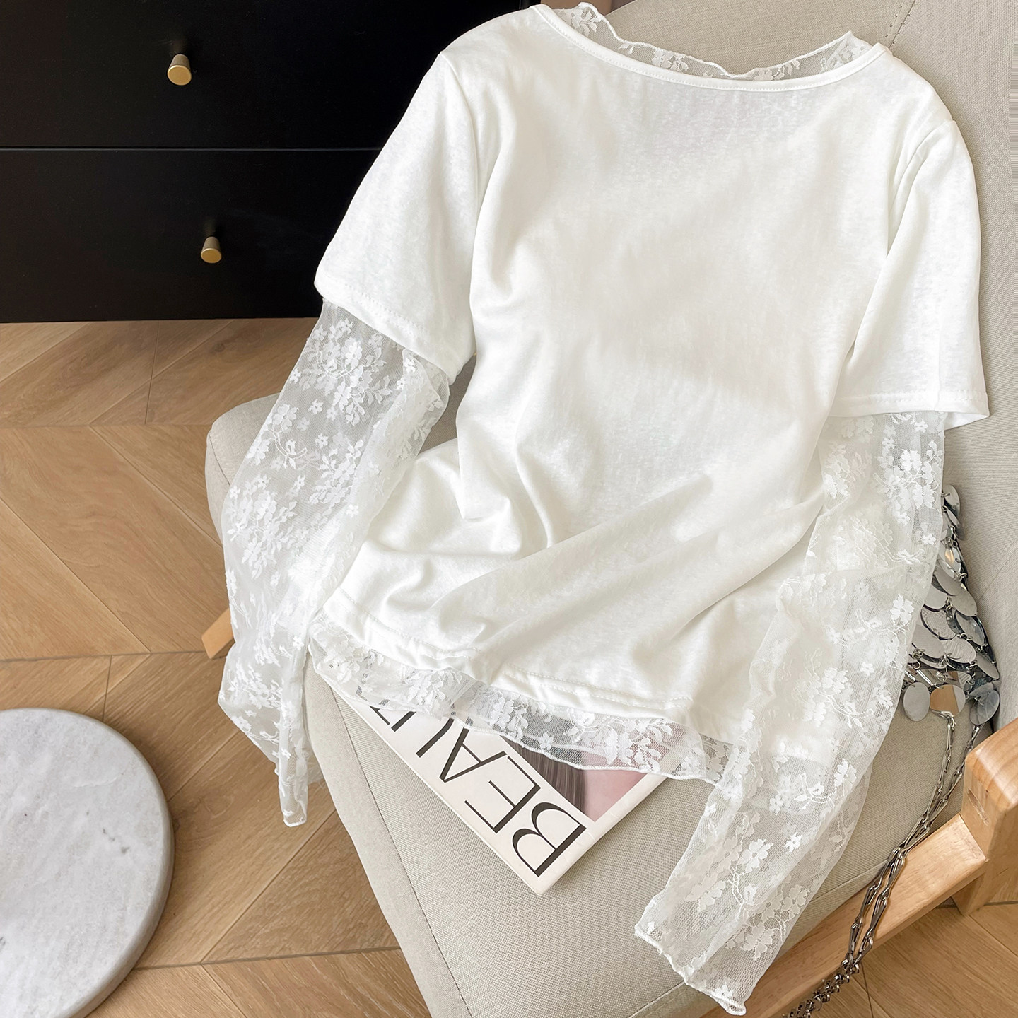 小C家蕾丝绣花网纱拼接假两件上衣女2026新款春季白色正肩长袖T恤