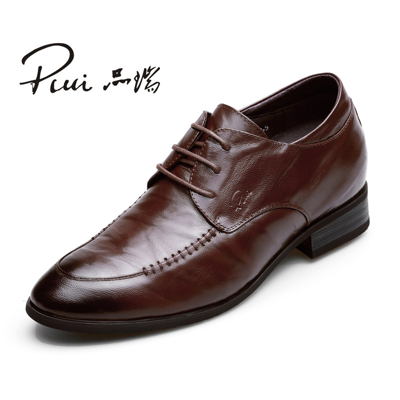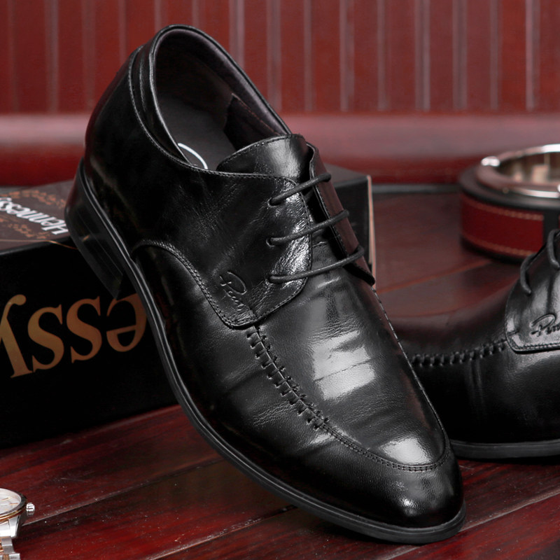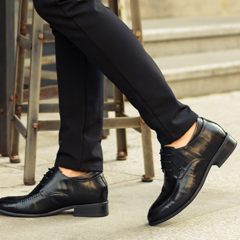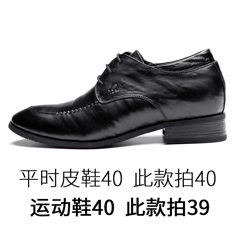 尖头系带小羊皮鞋隐形内增高8厘米正装皮鞋男 硬底商务高跟黑色鞋
