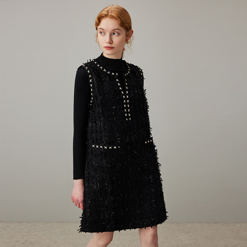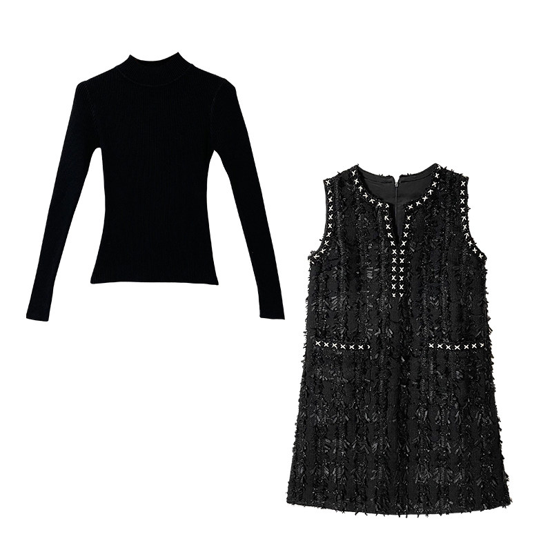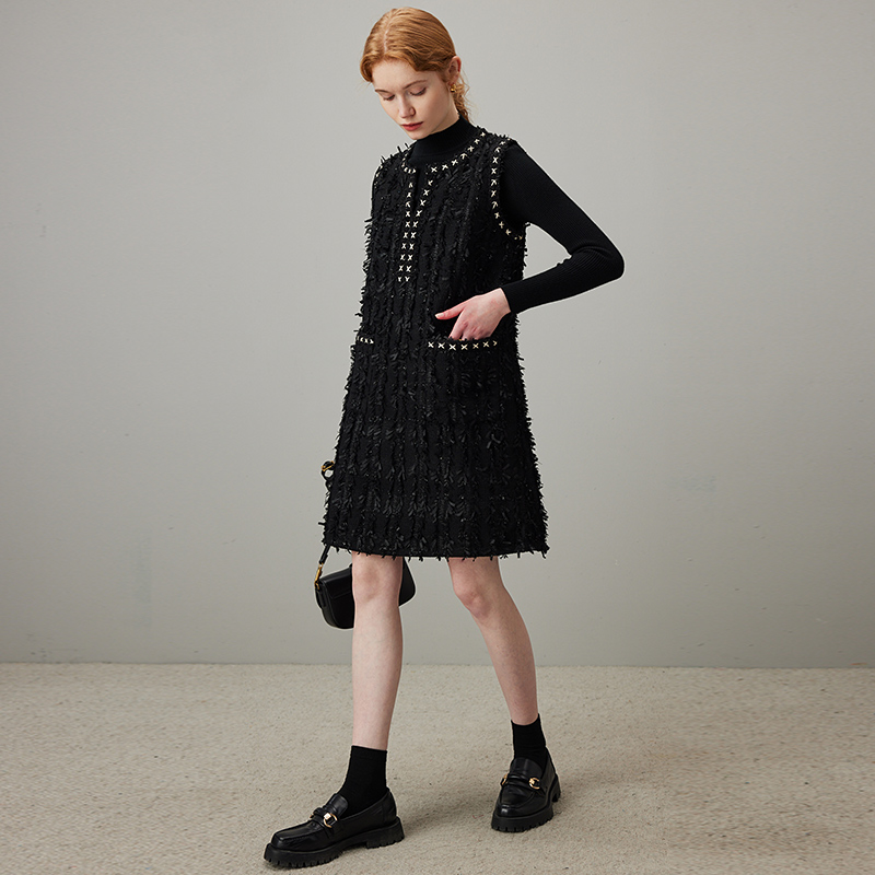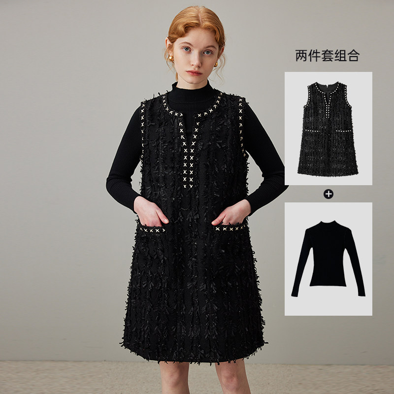 dfvc黑色名媛小香风背心裙女春季2026新款流苏小个子连衣裙两件套