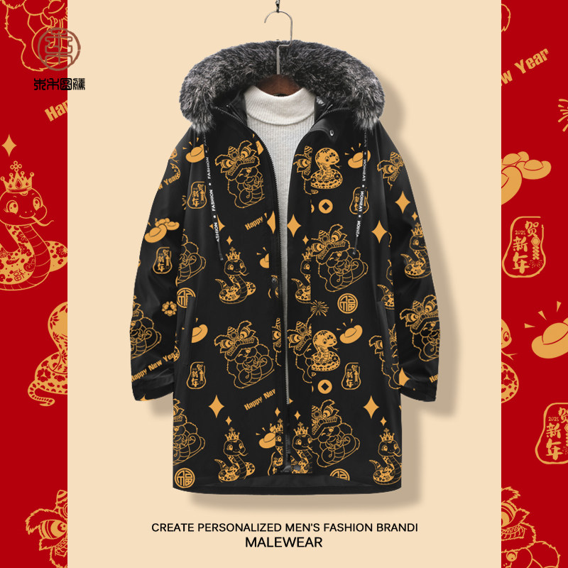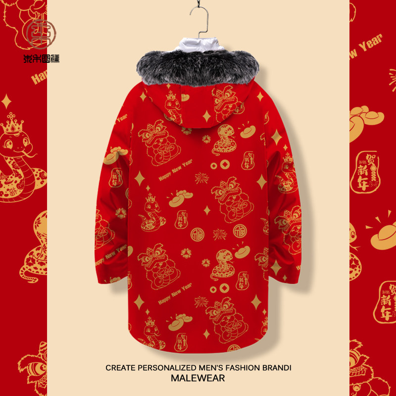 蛇年大红色羽绒服男款冬季潮牌青少年本命年加厚外套连帽过膝棉服