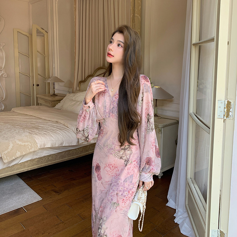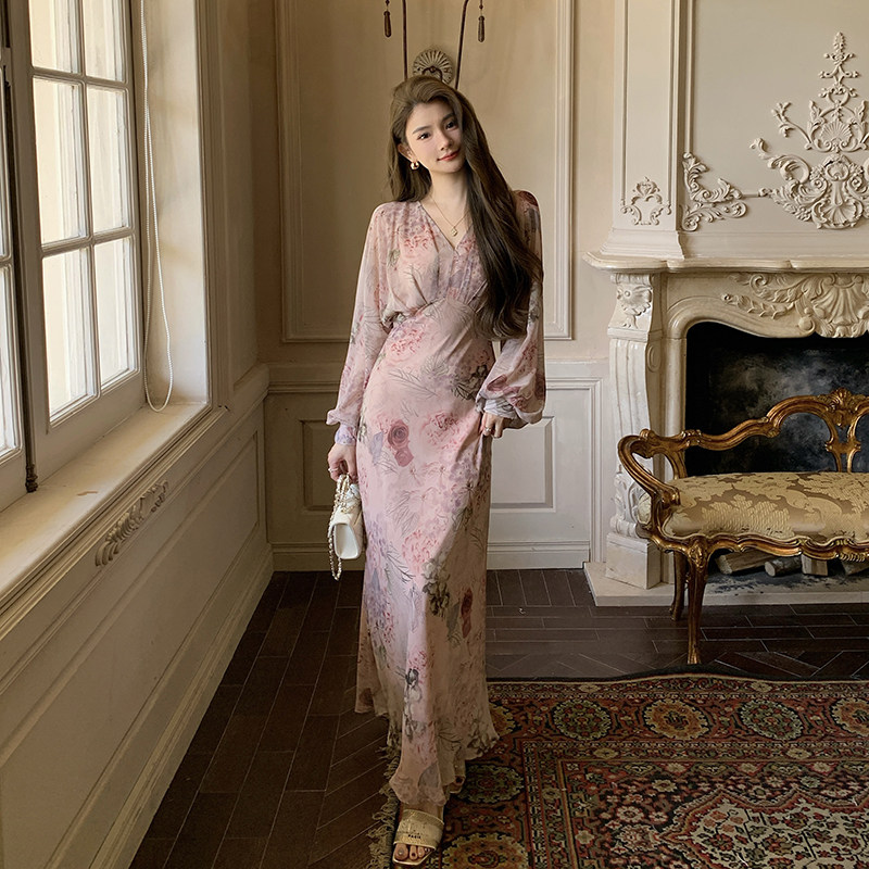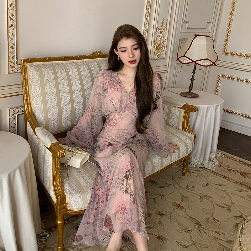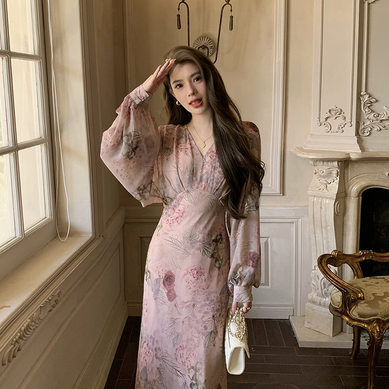AM NANA初秋法式气质长袖连衣裙女温柔风碎花小个子V领绝美长裙子