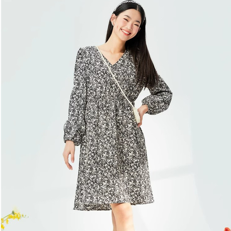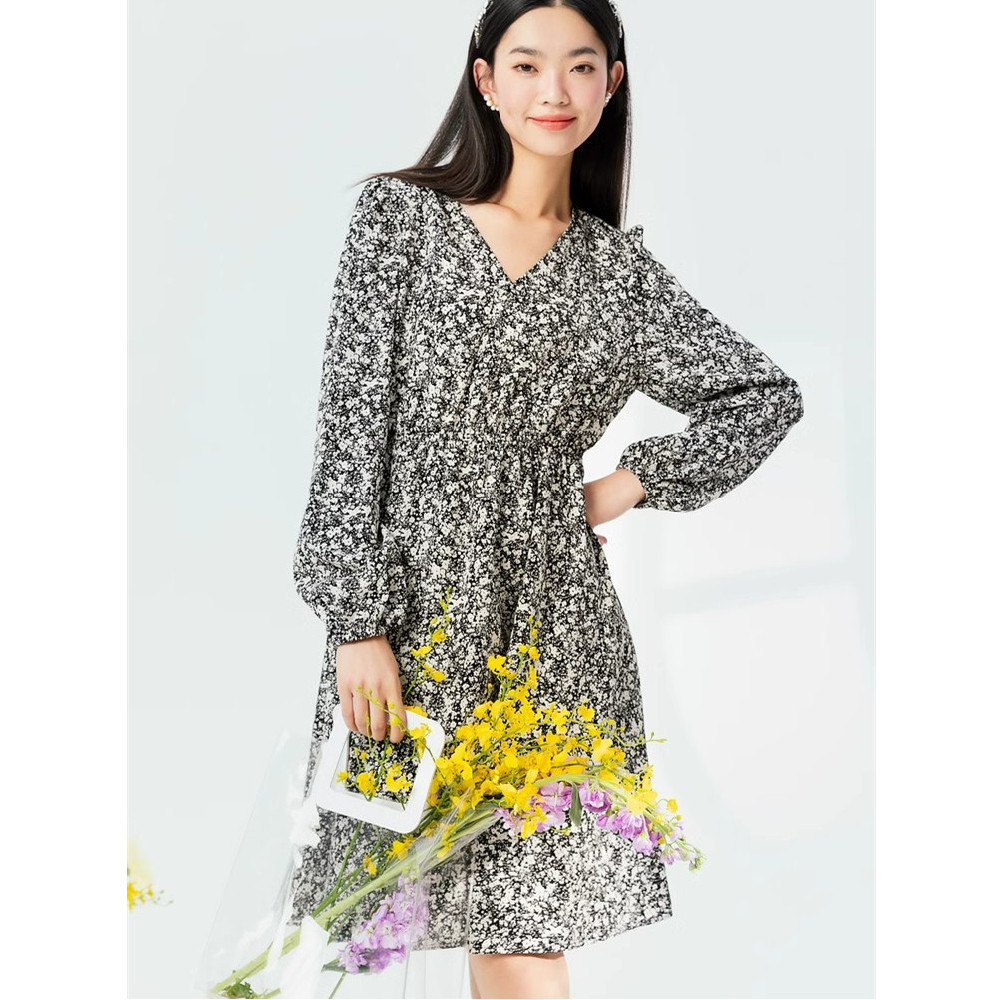 早春秋v领长袖碎花连衣裙子女新款茶歇法式收腰显瘦内搭打底短裙