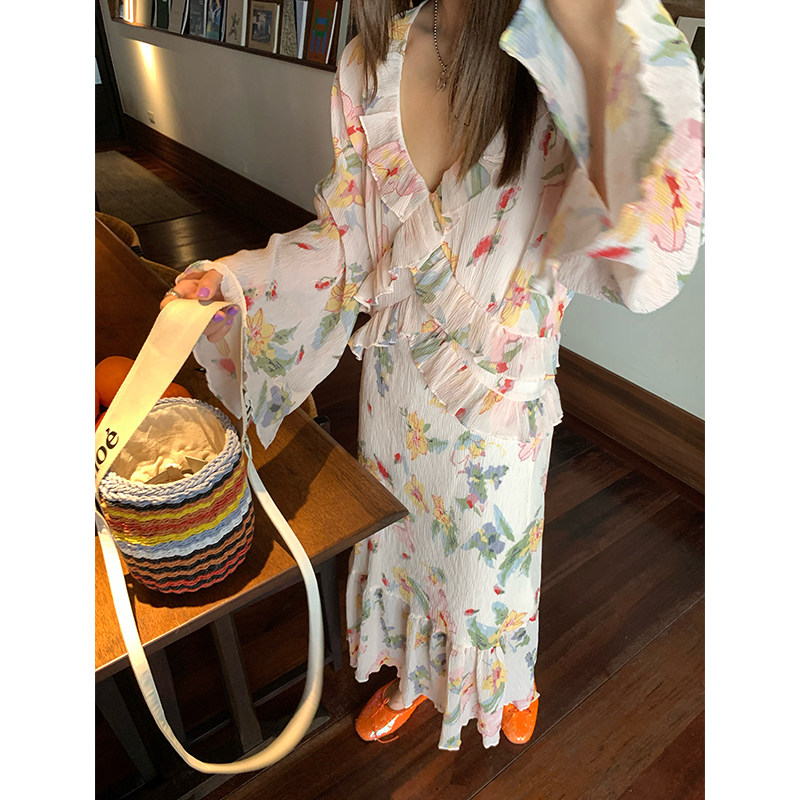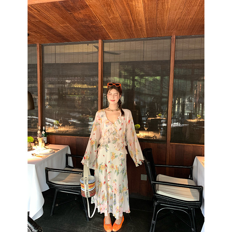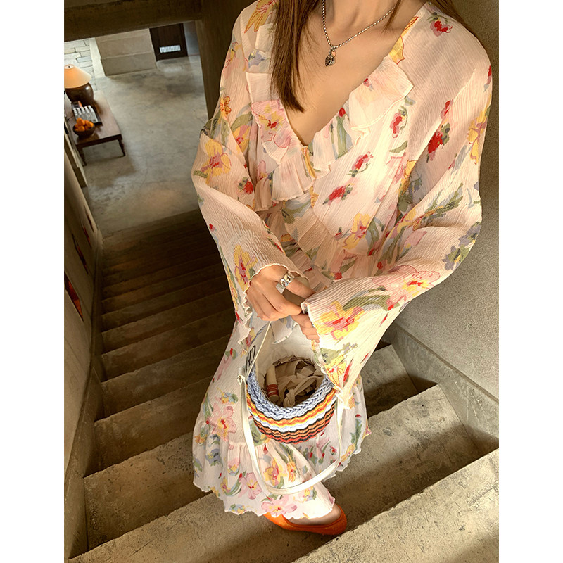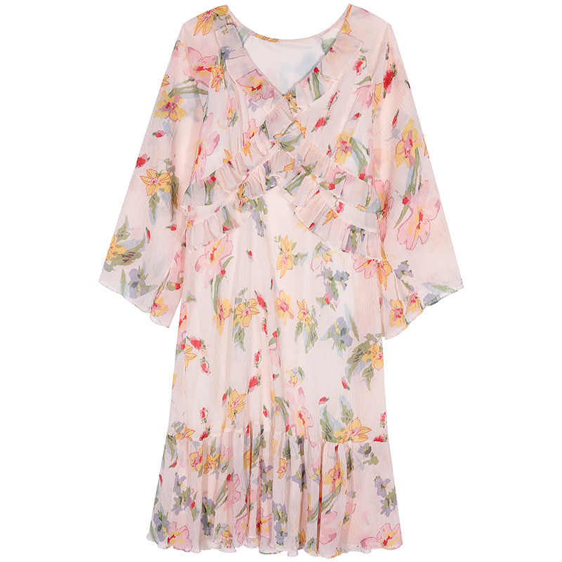 今屿花花 粉色V领碎花连衣裙女装2026新款春装长裙设计感长袖雪纺