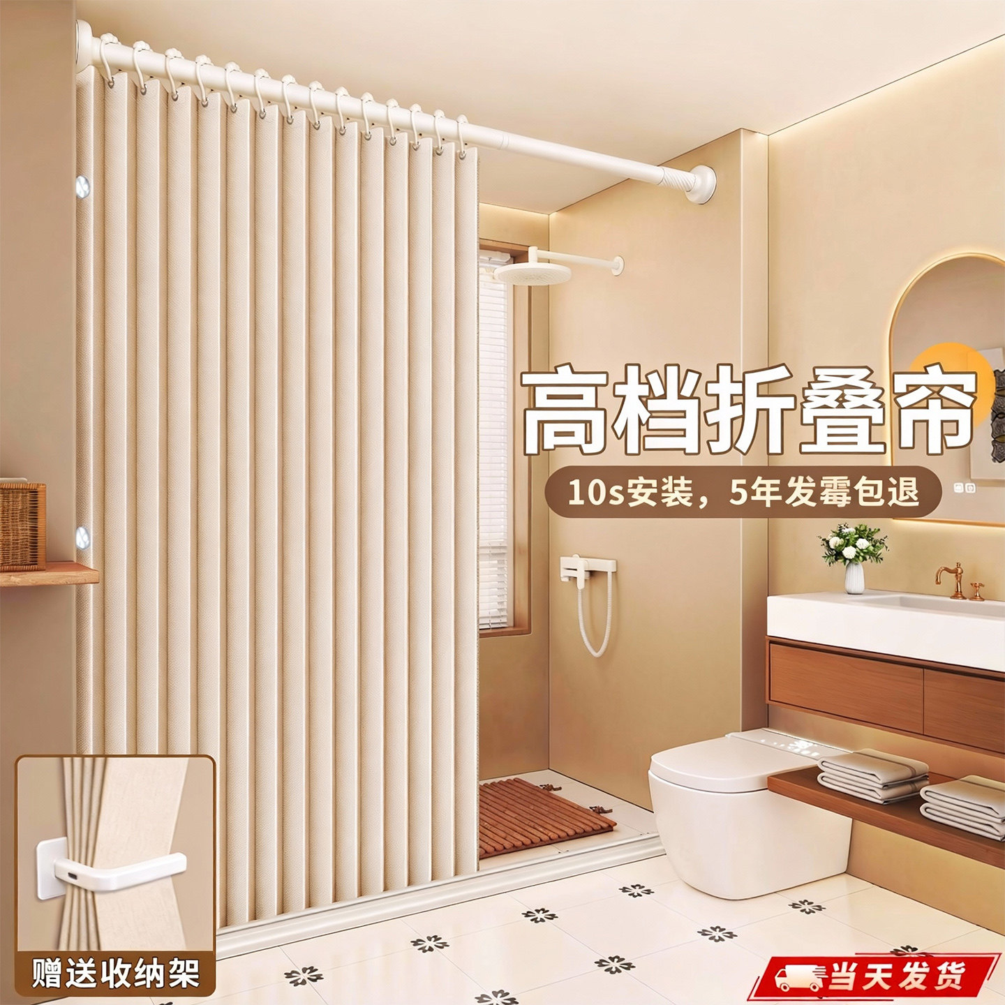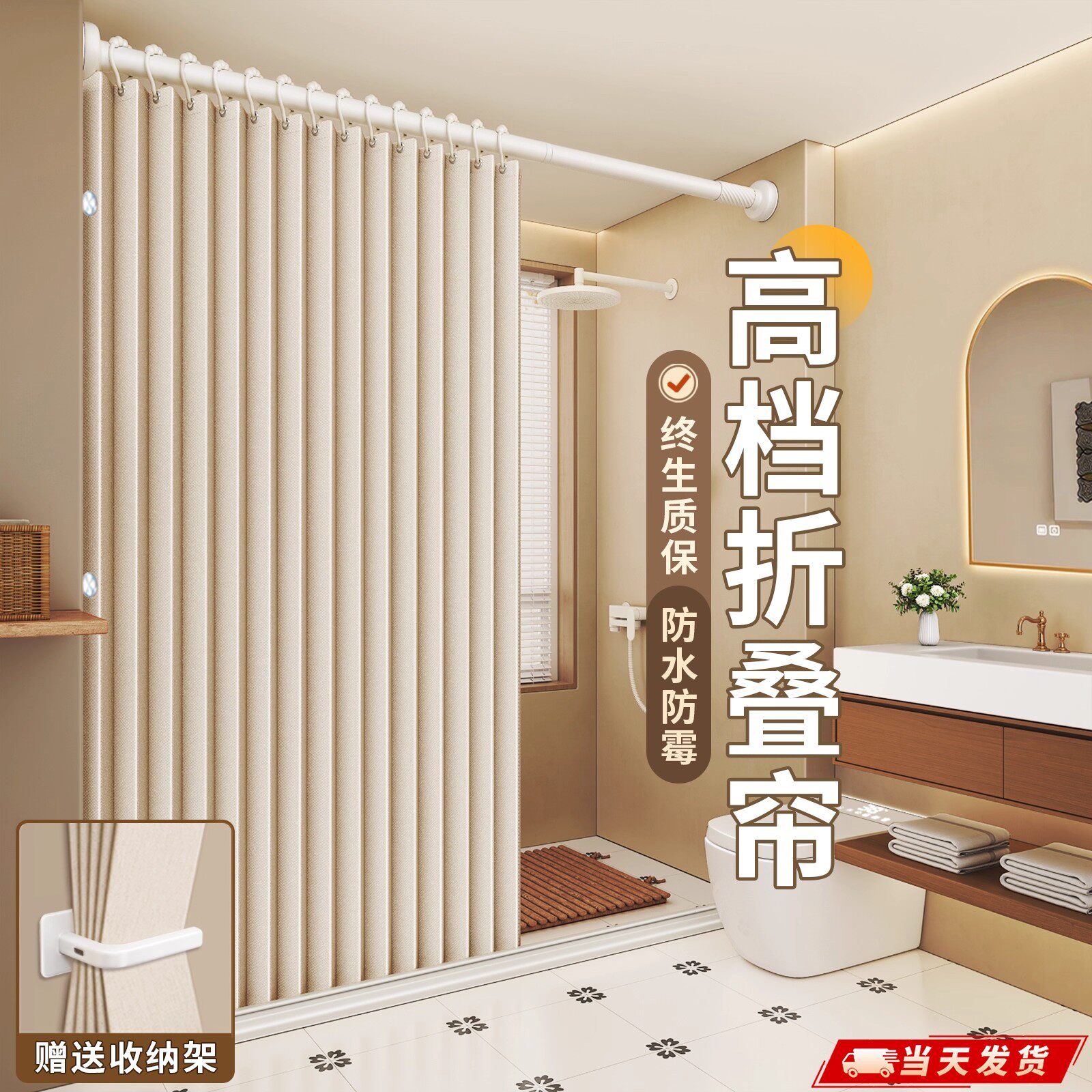 浴室高档折叠浴帘免打孔卫生间干湿分离隔断洗澡防水防霉淋浴门帘
