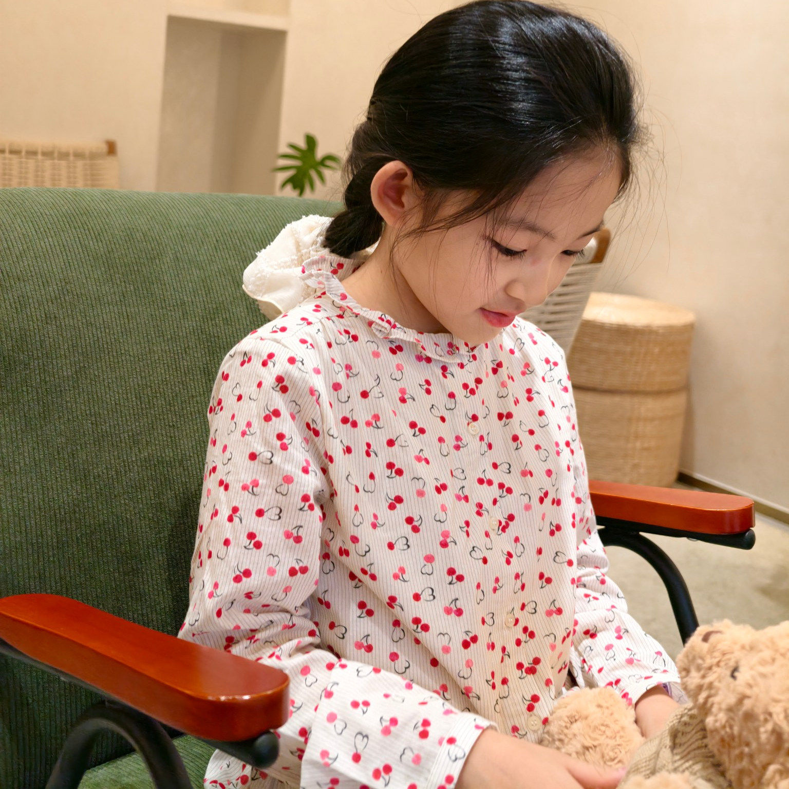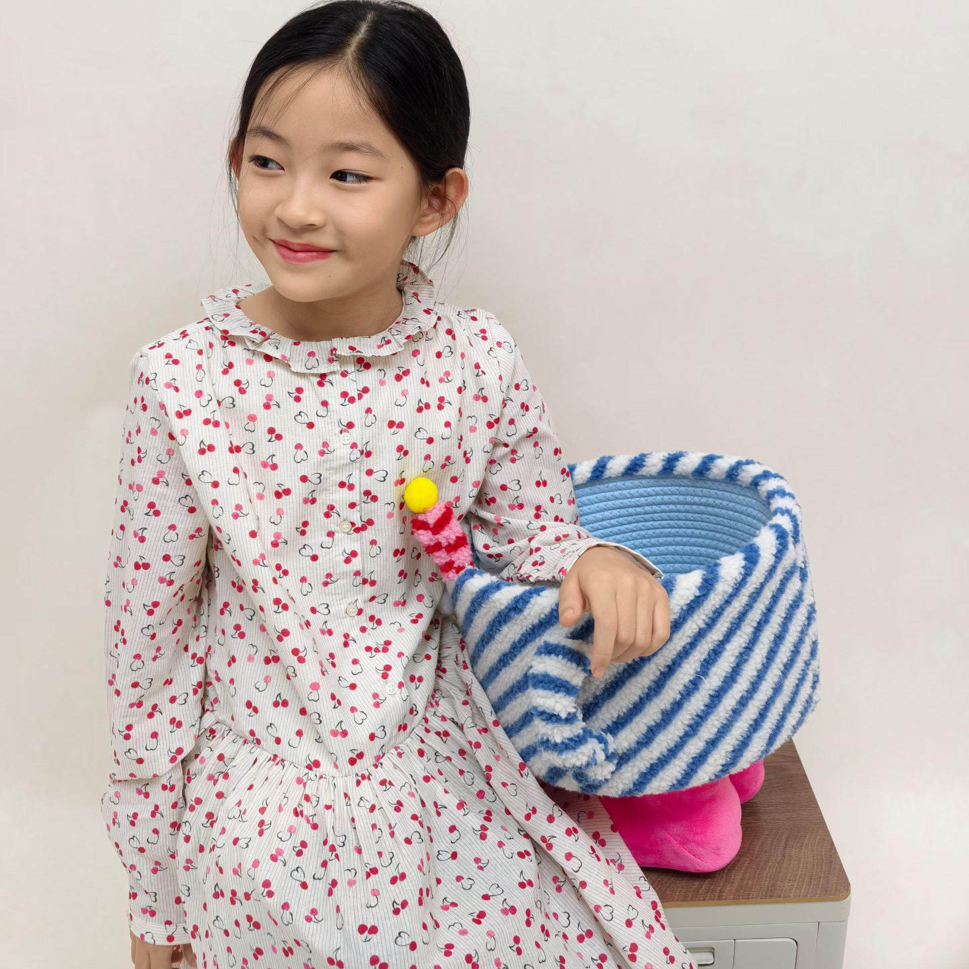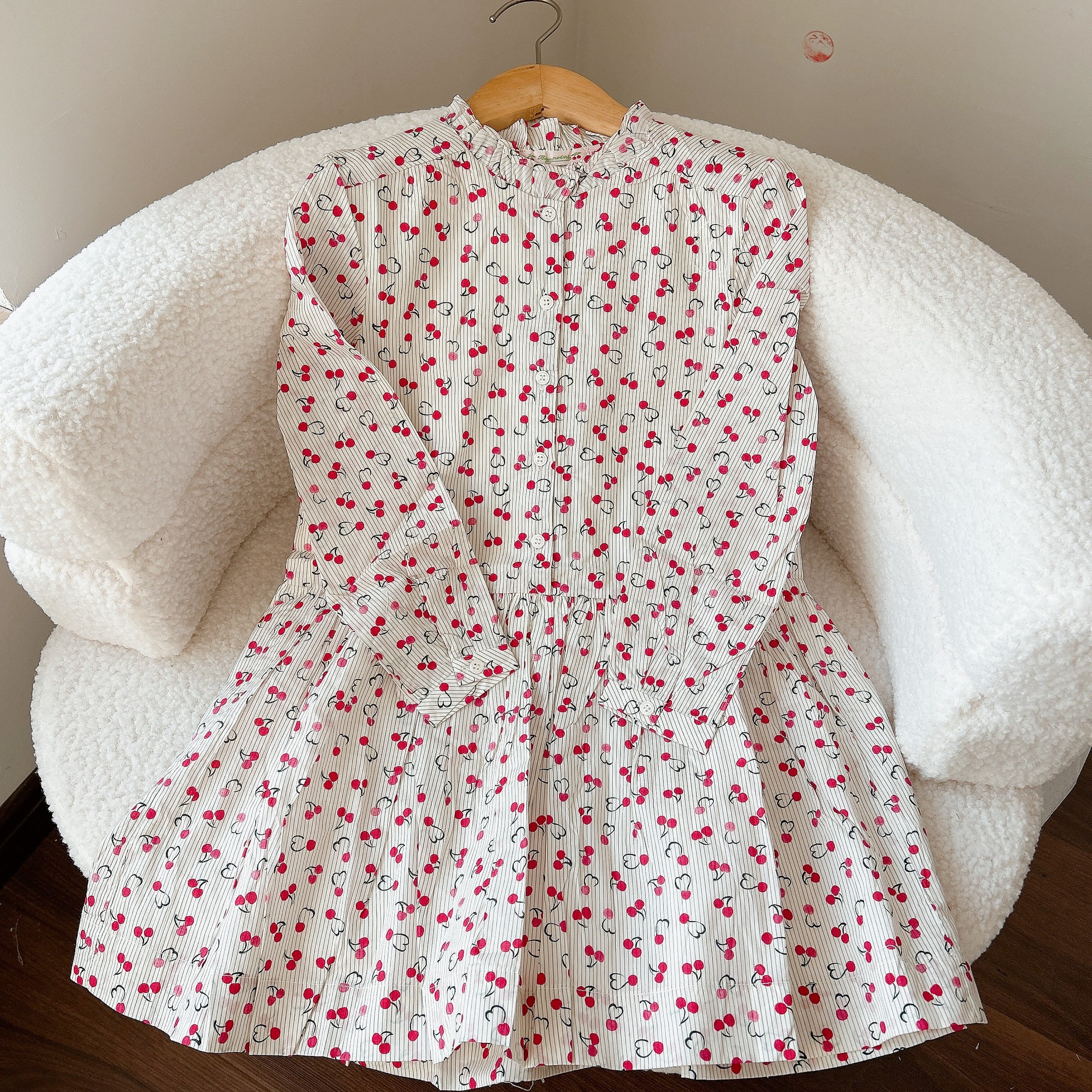 女童满印樱桃长袖连衣裙 儿童秋冬纯棉花边领裙子 25新款内搭裙