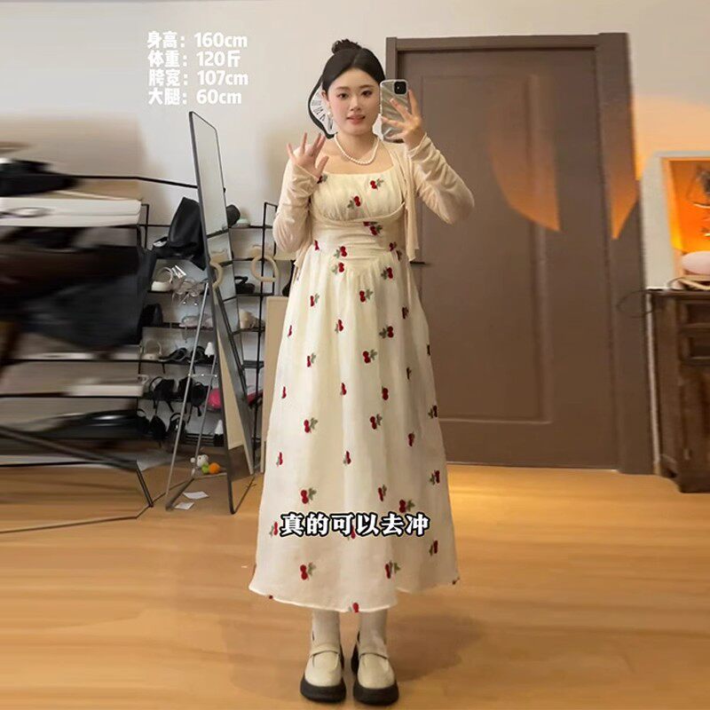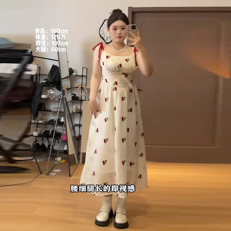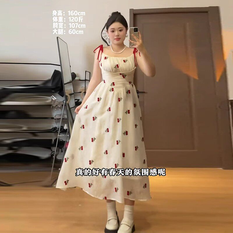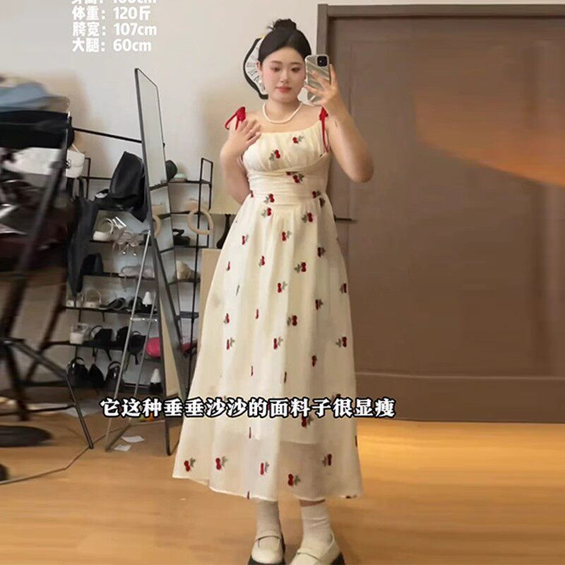 大码法式方领泡泡袖连衣裙女夏胖mm樱桃刺绣温柔风海边度假吊带裙