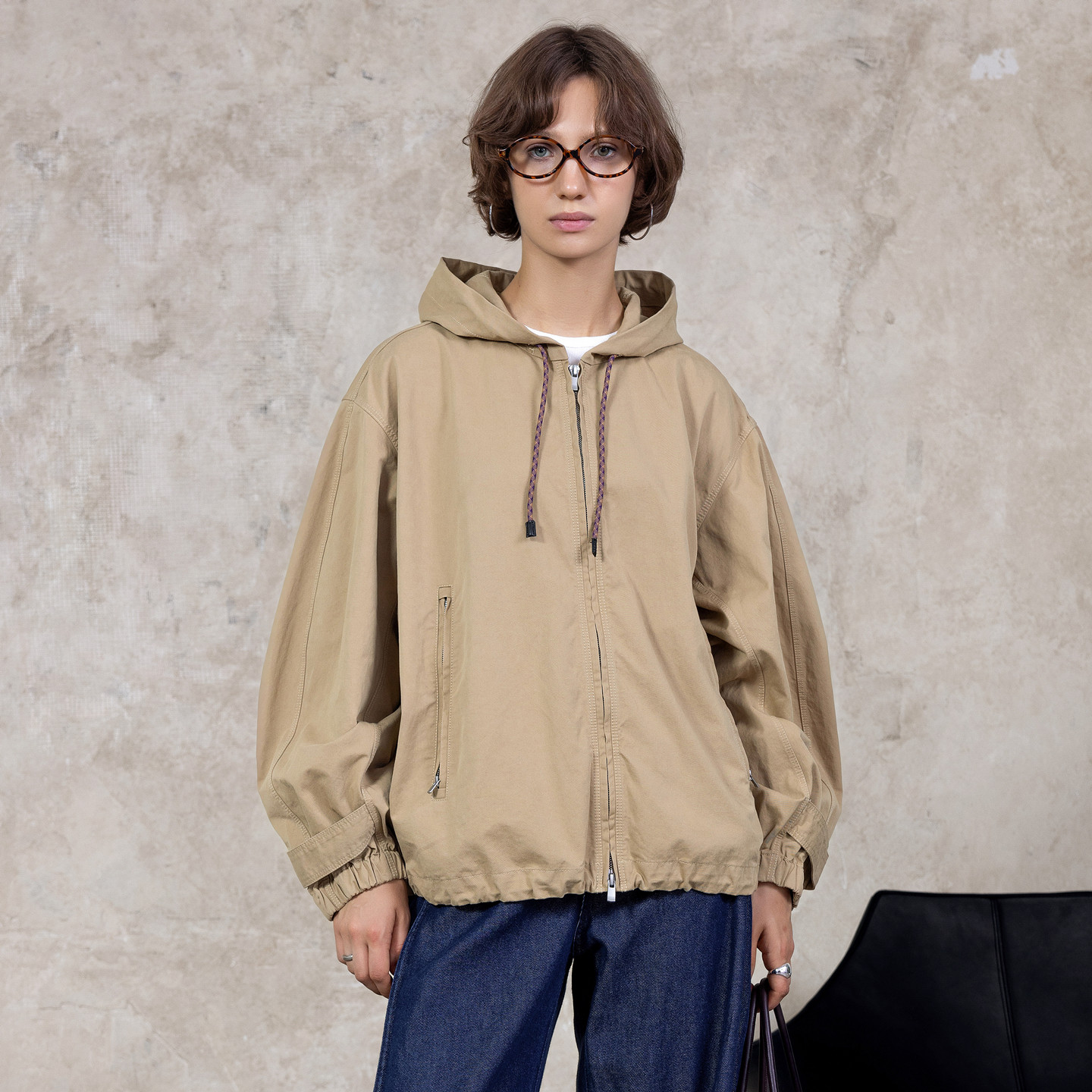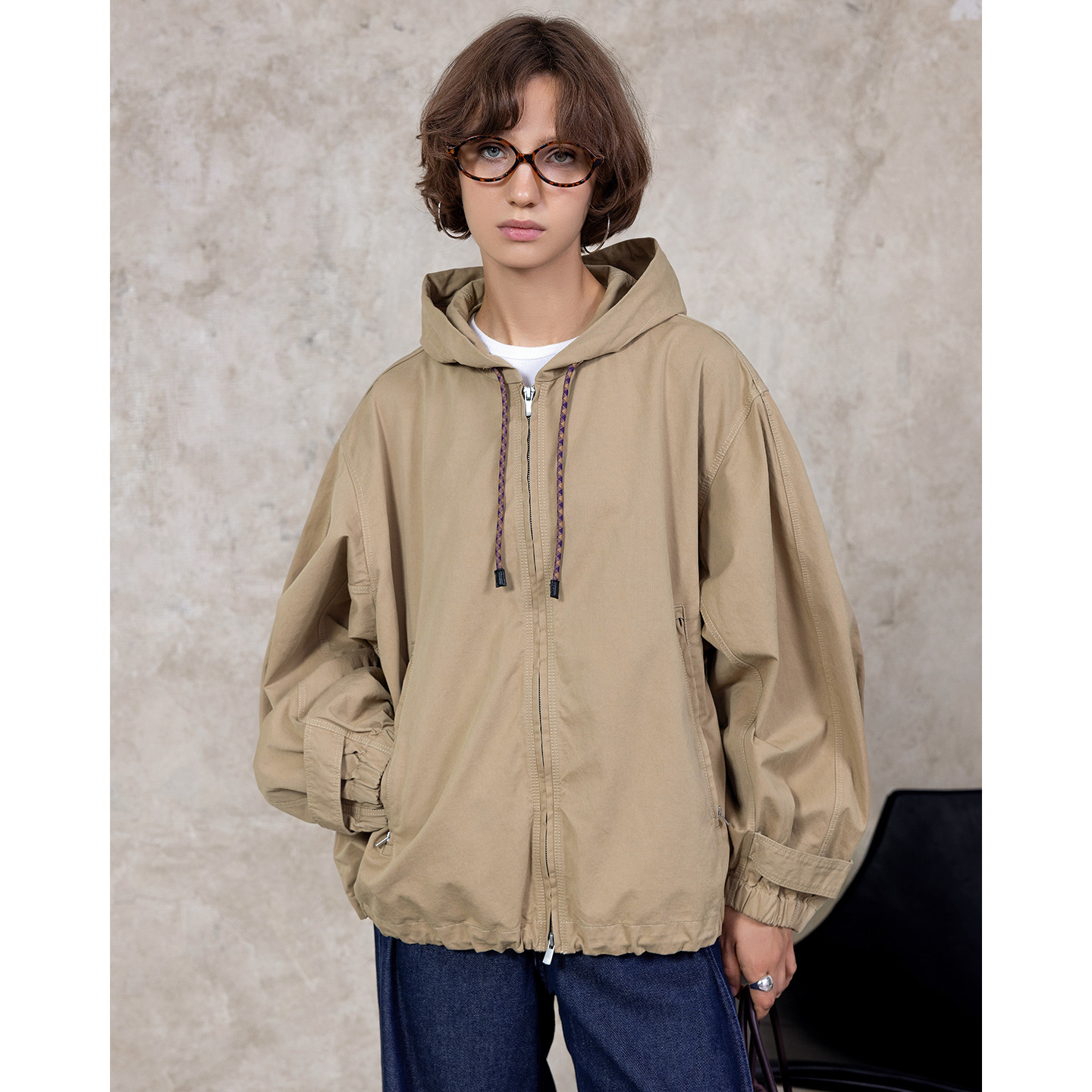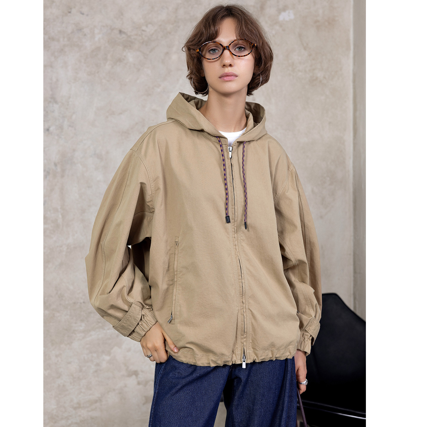 风衣女款2026新款春季复古百搭宽松休闲短款拉链抽绳连帽夹克外套