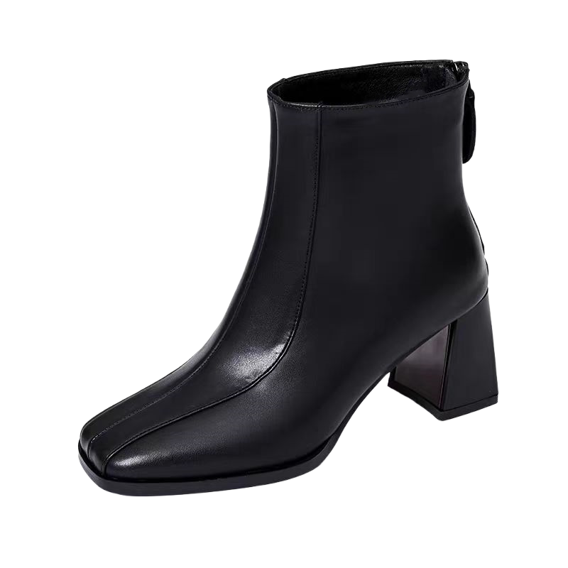 品牌真皮高跟方头小短靴女2025新款英伦复古秋冬加绒粗跟马丁靴子